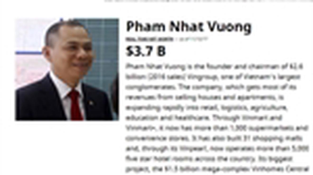 Theo tính toán của Forbes, tính tới 13/11/2017, khối tài sản của ông của ông Phạm Nhật Vượng có giá trị 3,7 tỷ USD, cao hơn khá nhiều so với ông Donald Trump (3,1 tỷ USD) và tỷ phú người Mỹ gốc Việt Hoàng Kiều (2,8 tỷ USD).