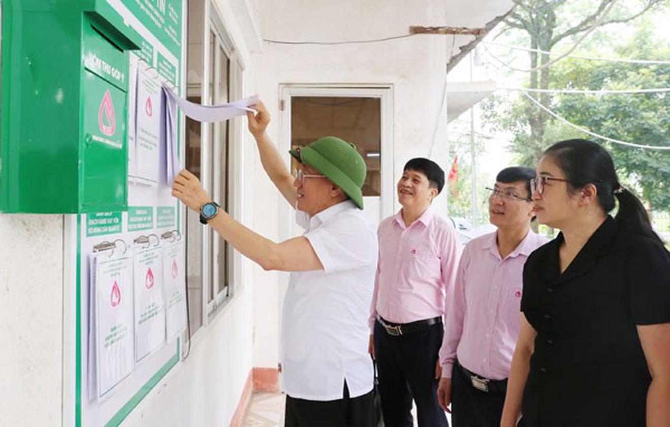 Tổng Giám đốc NHCSXH Dương Quyết Thắng kiểm tra thông tin giao dịch của NHCSXH được niêm yết tại điểm giao dịch