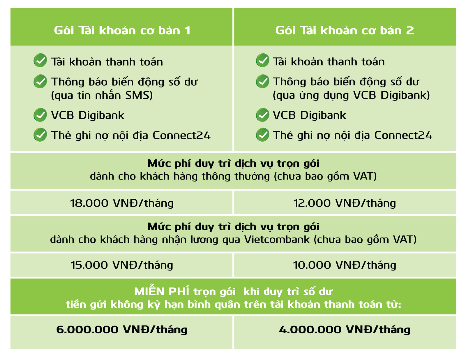 Bản thông tin chi tiết 2 loại Gói Tài khoản cơ bản của Vietcombank