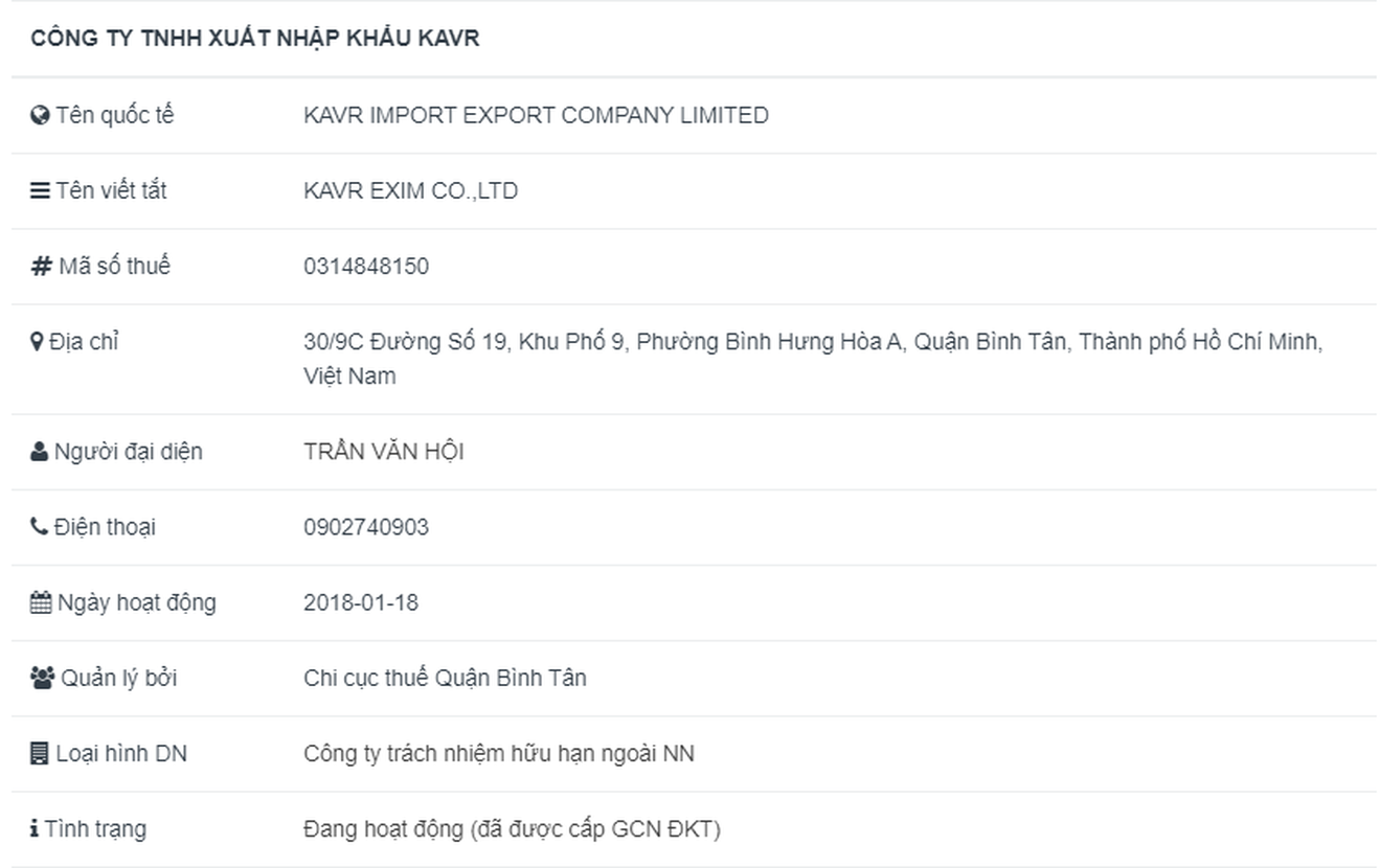 Theo quyết định, Công ty TNHH Xuất nhập khẩu KAVR, trụ sở chính tại 30/9C đường số 19, khu phố 9, phường Bình Hưng Hòa A, quận Bình Tân, TP Hồ Chí Minh do ông Trần Văn Hội làm Giám đốc Kinh doanh mỹ phẩm có công thức không đúng với hồ sơ công bố đã được phê duyệt, vi phạm quy định tại điểm c Khoản 3 Điều 71 Nghị định số 117/2020/NĐ- CP ngày 28/9/2020 của Chính phủ về xử phạt vi phạm hành chính trong lĩnh vực y tế.