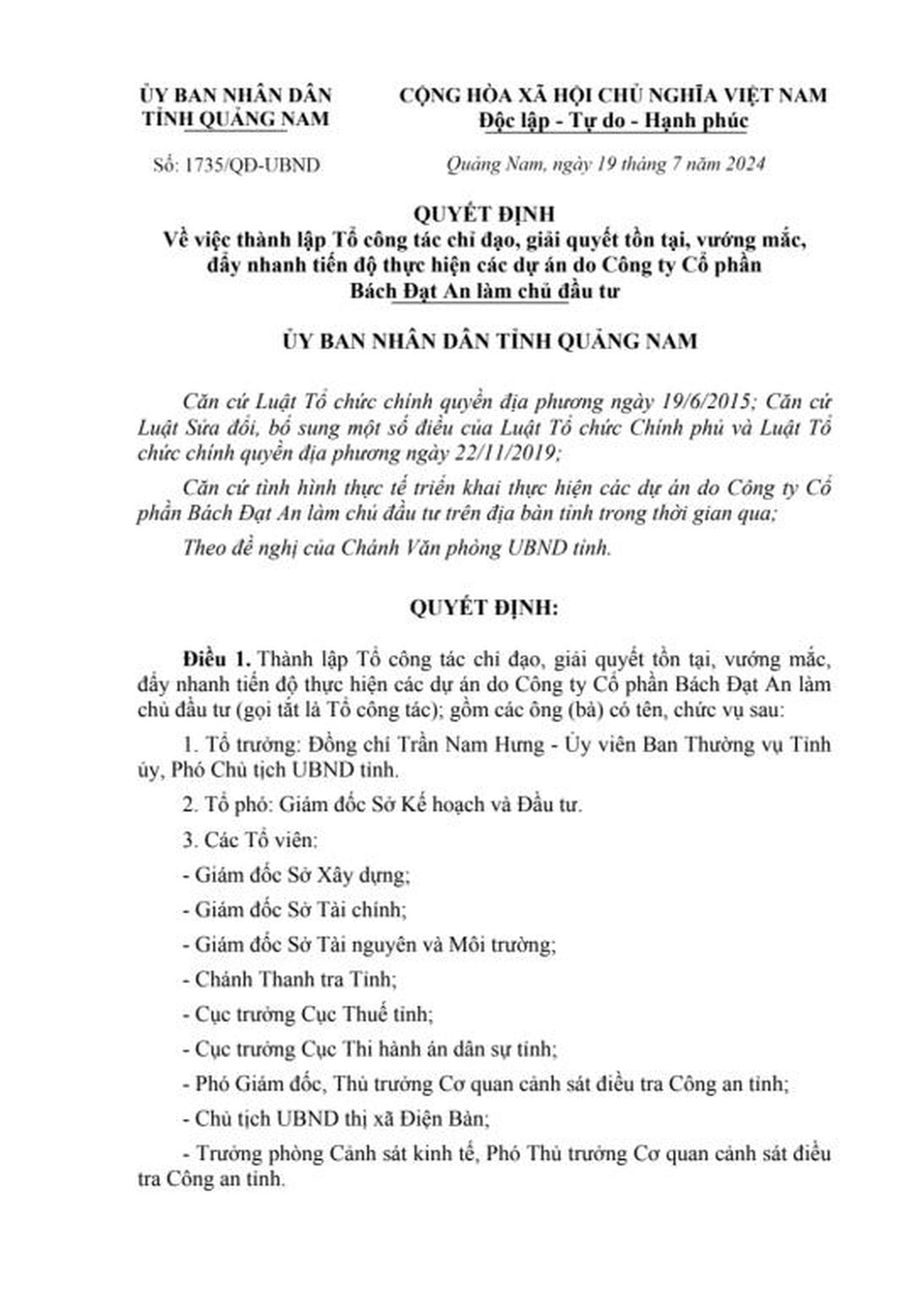 (Thanh tra) - Chủ tịch UBND tỉnh Quảng Nam Lê Văn Dũng vừa quyết định thành lập tổ công tác chỉ đạo, giải quyết tồn tại, vướng mắc, đẩy nhanh tiến độ thực hiện các dự án do Công ty Cổ phần Bách Đạt An (Công ty Bách Đạt An) làm chủ đầu tư (gọi tắt là tổ công tác).