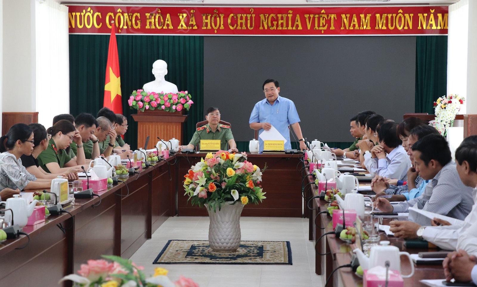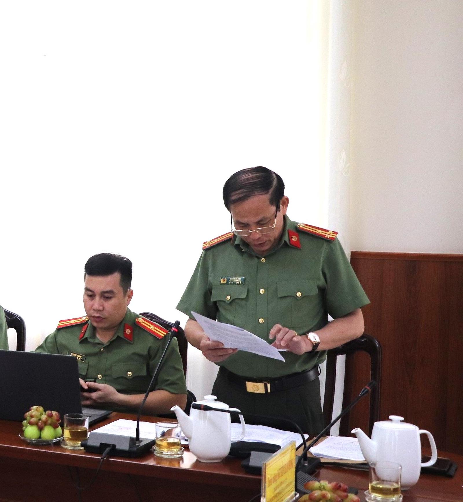 Đại tá Lê Quang Đồng, Phó Giám đốc Công an tỉnh báo cáo tóm tắt kết quả chấp hành các quy định của pháp luật về quản lý một số ngành, nghề đầu tư kinh doanh có điều kiện về ANTT; quản lý, sử dụng con dấu; quản lý CCCD, Cơ sở dữ liệu quốc gia về dân cư và Cơ sở dữ liệu CCCD của UBND tỉnh Ninh Thuận.