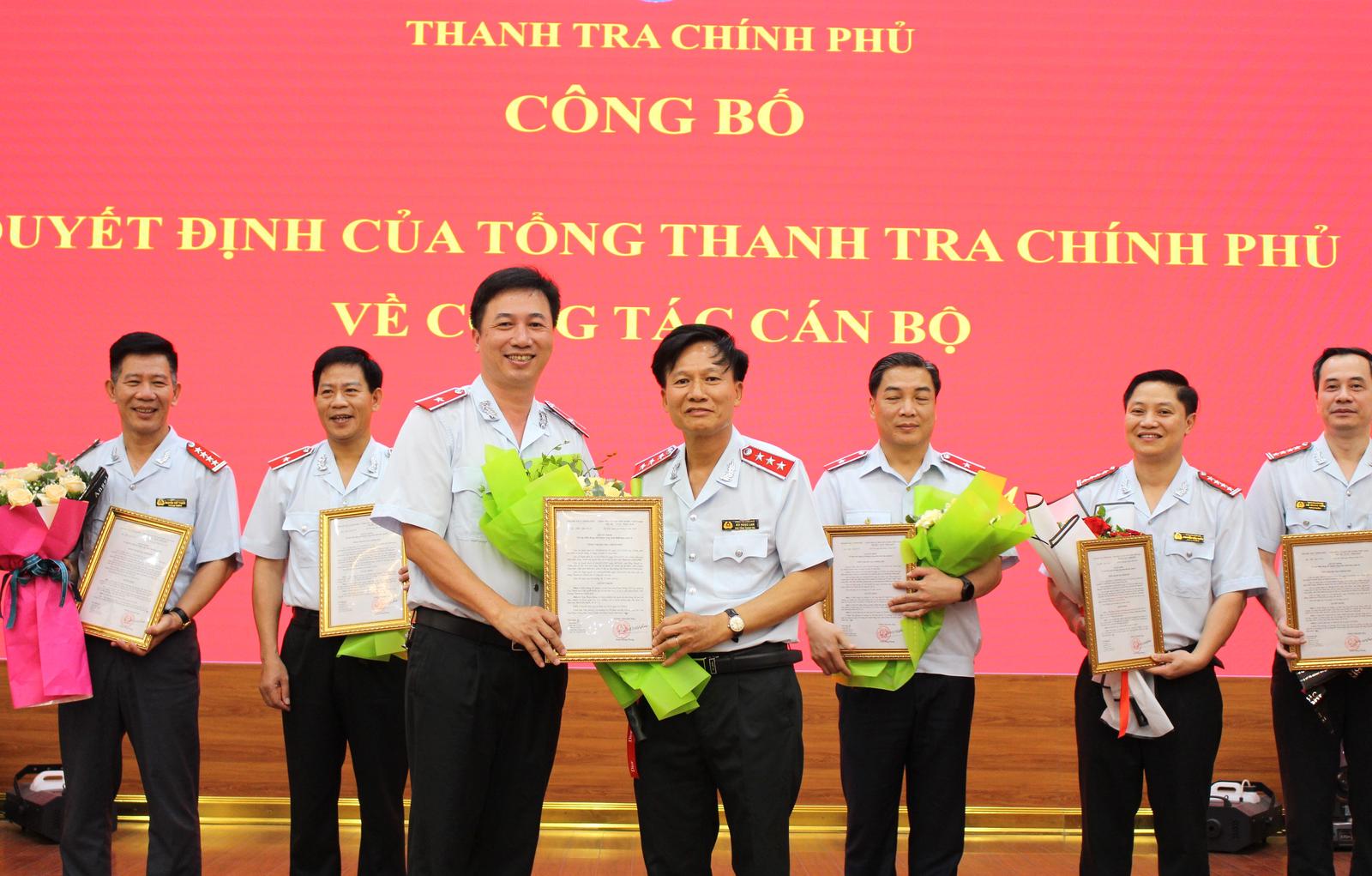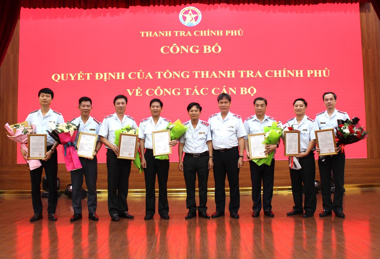 Phó Tổng Thanh tra Chính phủ Bùi Ngọc Lam, Vụ trưởng Vụ Tổ chức cán bộ Nguyễn Hữu Hòa chụp ảnh lưu niệm cùng các đồng chí vừa nhận quyết định. Ảnh: PH