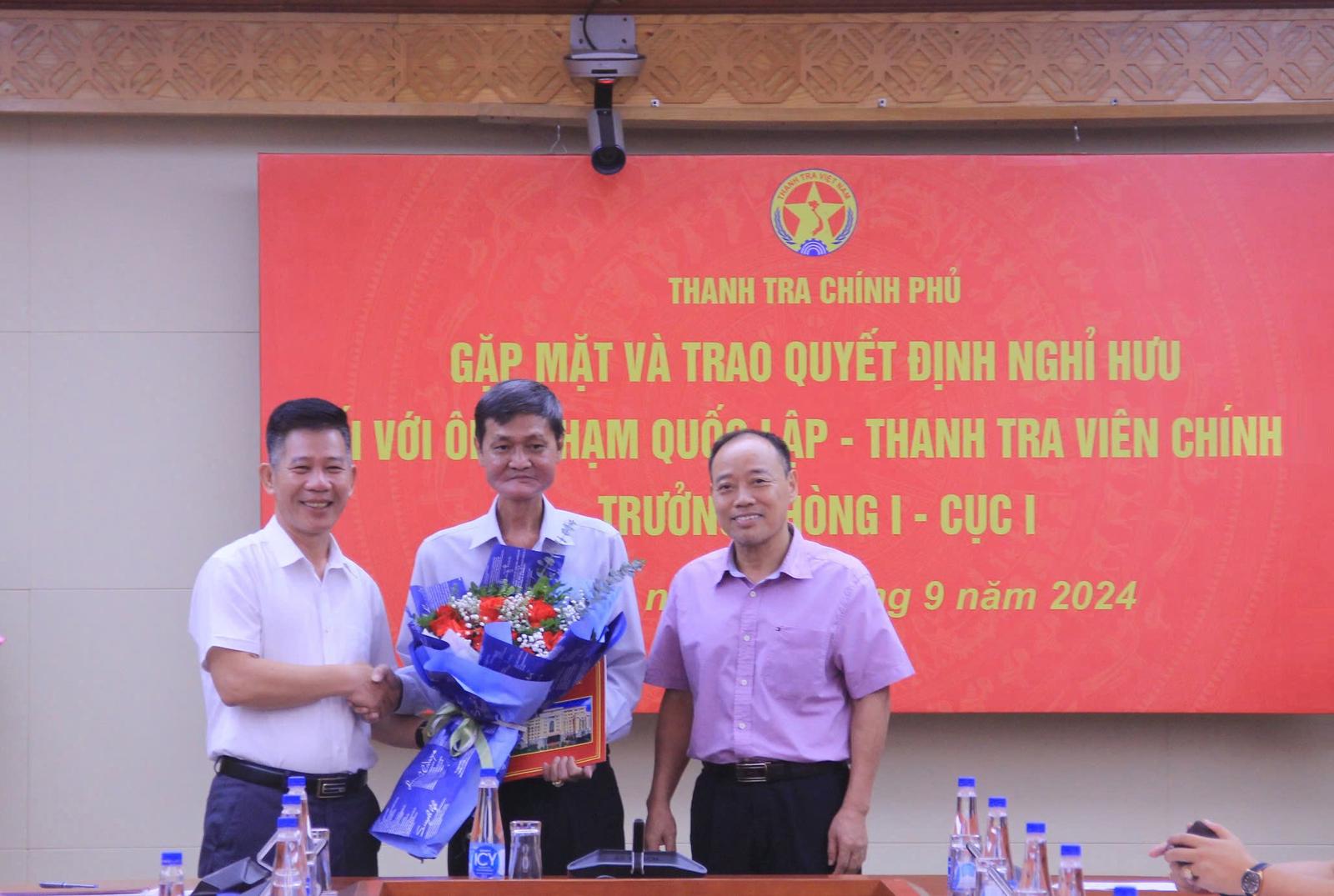 Cũng trong sáng ngày 30/9, Thanh tra Chính phủ cũng tổ chức gặp mặt và trao quyết định nghỉ hưu đối với ông Phạm Quốc Lập, thanh tra viên chính, Trưởng Phòng 1, Cục Thanh tra, Giải quyết khiếu nại, tố cáo khu vực 1, Thanh tra Chính phủ nghỉ hưu theo chế độ.