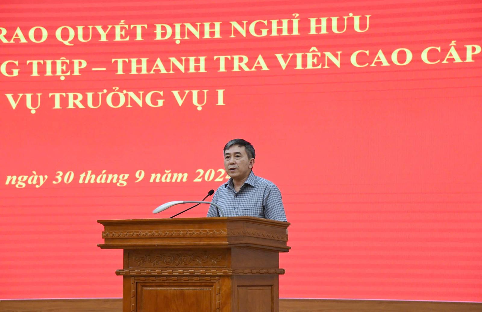Thay mặt tập thể lãnh đạo, Chi ủy, Công đoàn Vụ, Vụ trưởng Vụ I Hoàng Hưng gửi lời cảm ơn, sự trân trọng trước những đóng góp của đồng chí Tiệp trong suốt những năm gắn bó với ngành Thanh tra, với Vụ I. Đồng thời mong muốn đồng chí Tiệp tiếp tục theo dõi, chia sẻ kinh nghiệm để Vụ I hoàn thành tốt hơn nữa nhiệm vụ được giao.