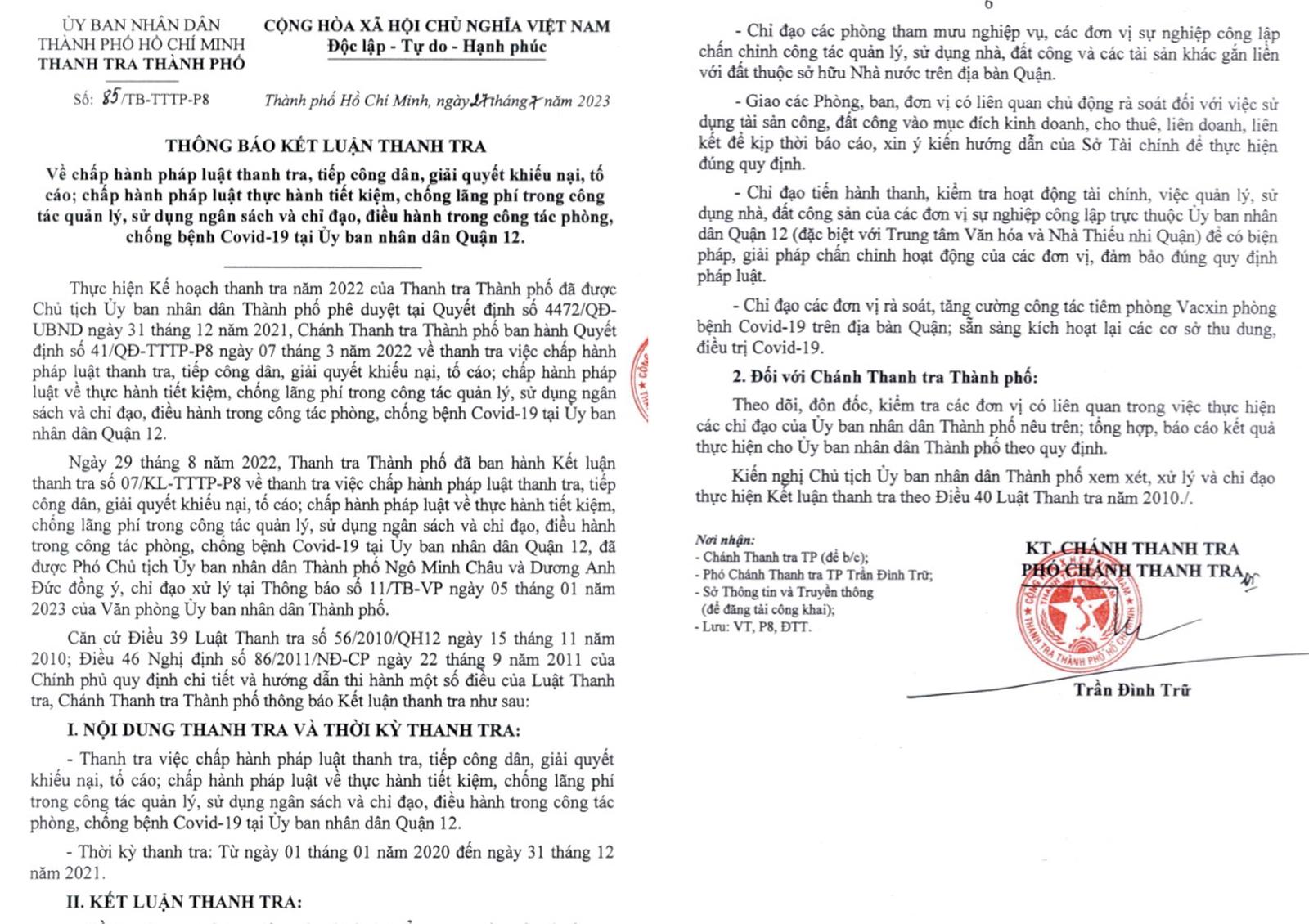 (Thanh tra)- Thanh tra TP Hồ Chí Minh có Văn bản số 85/TB-TTTP-P8 ngày 27/7/2023, thông báo kết luận thanh tra (KLTT) về chấp hành pháp luật thanh tra, tiếp công dân, giải quyết khiếu nại, tố cáo (KN, TC); chấp hành pháp luật thực hành tiết kiệm, chống lãng phí trong công tác quản lý, sử dụng ngân sách và chỉ đạo, điều hành trong công tác phòng, chống bệnh Covid-19 tại UBND quận 12.