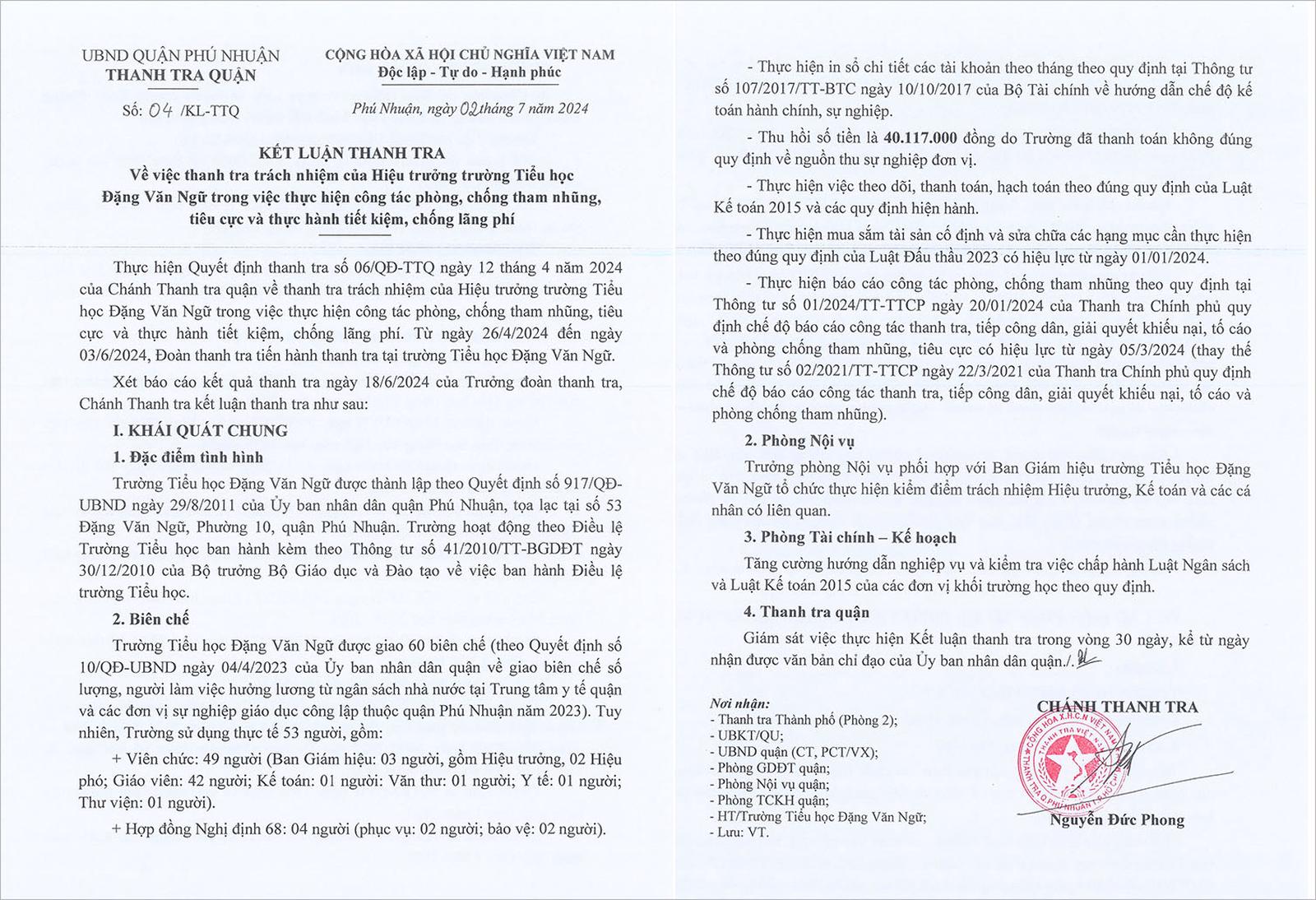 Thanh tra quận Phú Nhuận đã công khai Kết luận thanh tra số 04/KL-TTQ ngày 2/7/2024 về trách nhiệm của Hiệu trưởng Trường Tiểu học Đặng Văn Ngữ trong việc thực hiện công tác phòng, chống tham nhũng, tiêu cực và thực hành tiết kiệm, chống lãng phí.