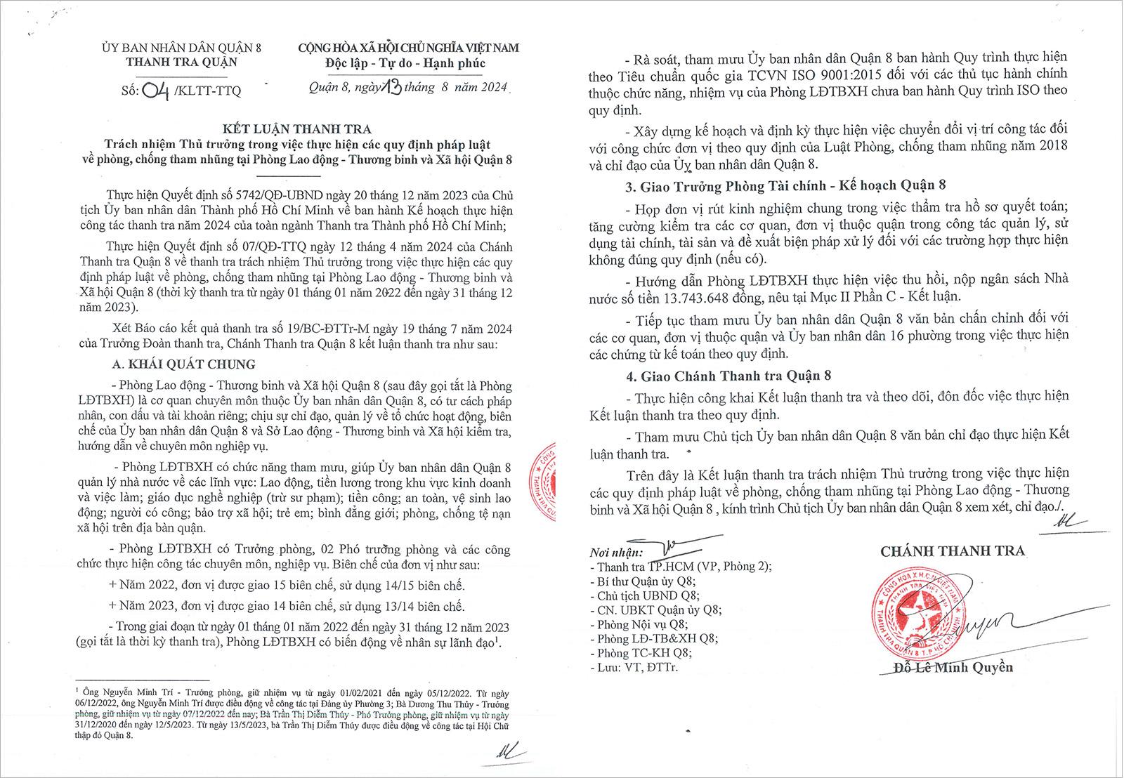 Thanh tra Quận 8, Thành phố Hồ Chí Minh đã công khai Kết luận thanh tra số 04/KLTT-TTQ ngày 13/8/2024 về trách nhiệm thủ trưởng trong việc thực hiện các quy định pháp luật về phòng, chống tham nhũng tại Phòng LĐTB&XH.