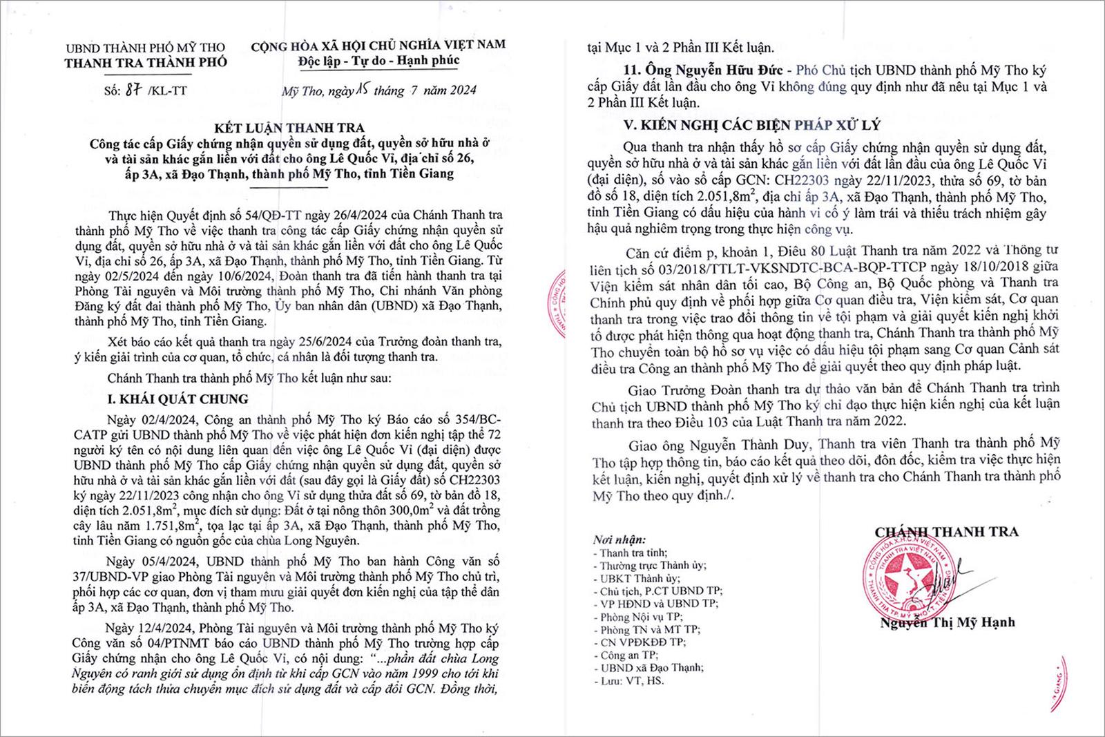 Thanh tra thành phố Mỹ Tho, tỉnh Tiền Giang, đã công khai Kết luận thanh tra số 87/KL-TT ngày 15/7/2024 về công tác cấp giấy chứng nhận quyền sử dụng đất, quyền sở hữu nhà ở và tài sản khác gắn liền với đất cho ông Lê Quốc Vỉ (địa chỉ xã Đạo Thạnh, thành phố Mỹ Tho).