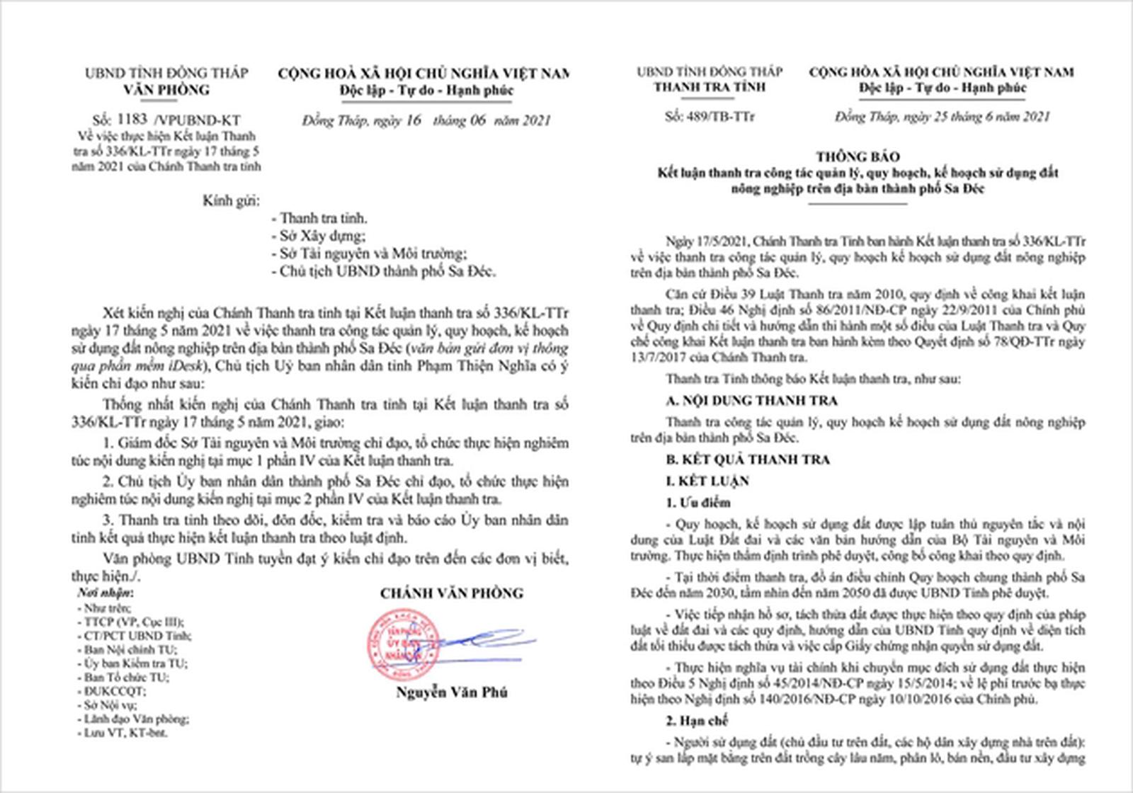Tại Kết luận thanh tra số 336/KL-TTr ngày 17/5/2021, Thanh tra tỉnh Đồng Tháp cho biết, bên cạnh một số kết quả đạt được như quy hoạch, kế hoạch sử dụng đất được lập tuân thủ nguyên tắc và nội dung của Luật Đất đai và các văn bản hướng dẫn của Bộ Tài nguyên và Môi trường (TN&MT); việc tiếp nhận hồ sơ, tách thửa đất được thực hiện theo quy định… công tác quản lý, quy hoạch, kế hoạch sử dụng đất nông nghiệp trên địa bàn TP Sa Đéc còn nhiều hạn chế, vi phạm.