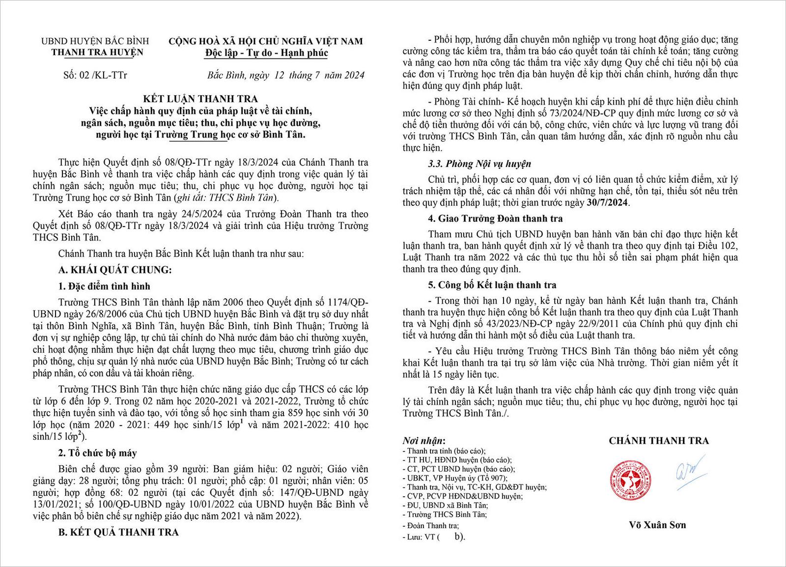 (Thanh tra) - Thanh tra huyện Bắc Bình, tỉnh Bình Thuận đã công khai Kết luận thanh tra số 02/KL-TTr ngày 12/7/2024 về chấp hành quy định của pháp luật tài chính, ngân sách, nguồn mục tiêu; thu chi phục vụ học đường, người học tại Trường Trung học cơ sở (THCS) Bình Tân. Qua thanh tra đã phát hiện nhiều hạn chế, sai phạm.