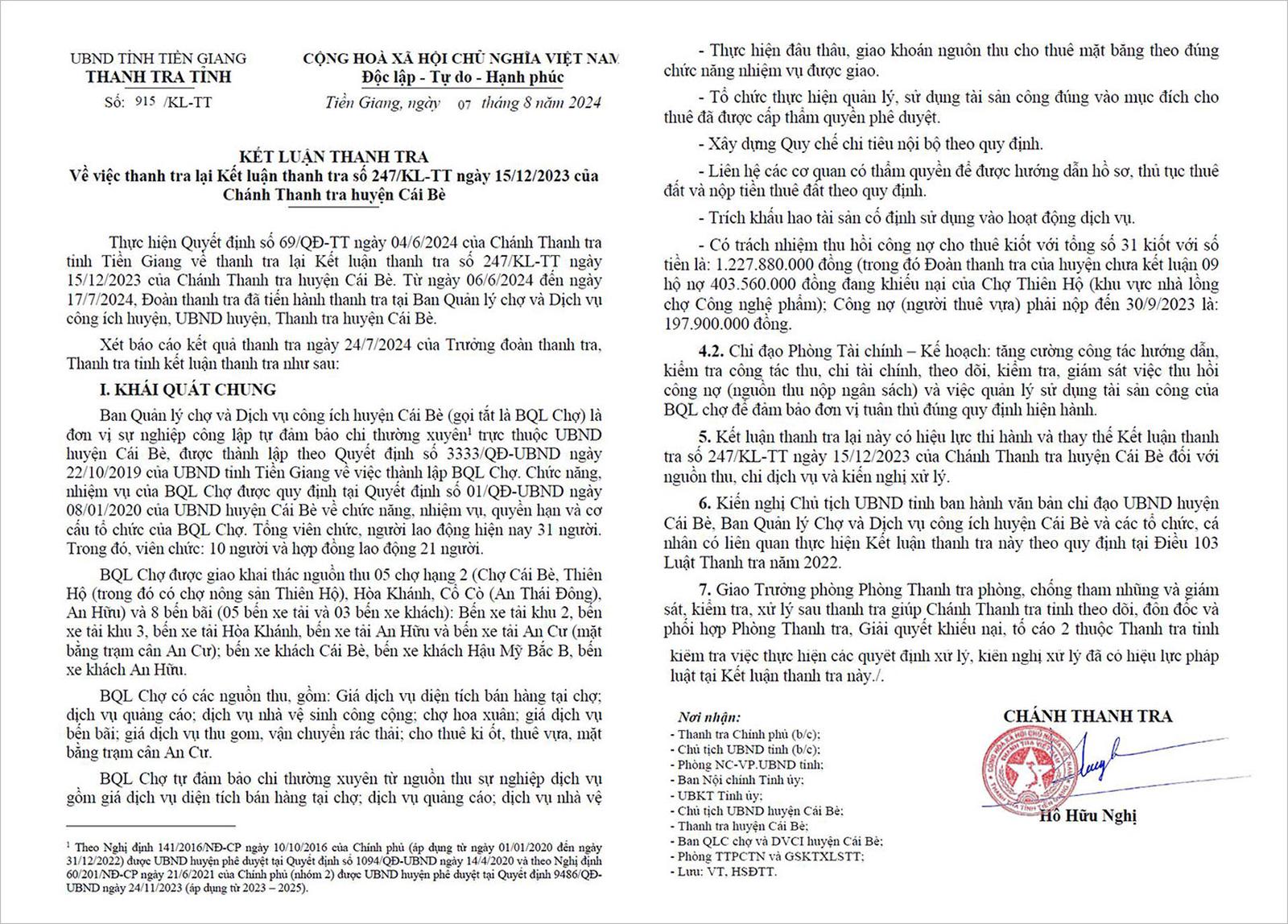 Thanh tra tỉnh Tiền Giang đã công khai Kết luận thanh tra số 915/KL-TT ngày 7/8/2024 về việc thanh tra lại Kết luận số 247/KL-TT ngày 15/12/2023 của Chánh Thanh tra huyện Cái Bè đối với Giám đốc BQL Chợ và Dịch vụ công ích trong việc thực hiện chức năng, nhiệm vụ được giao.
