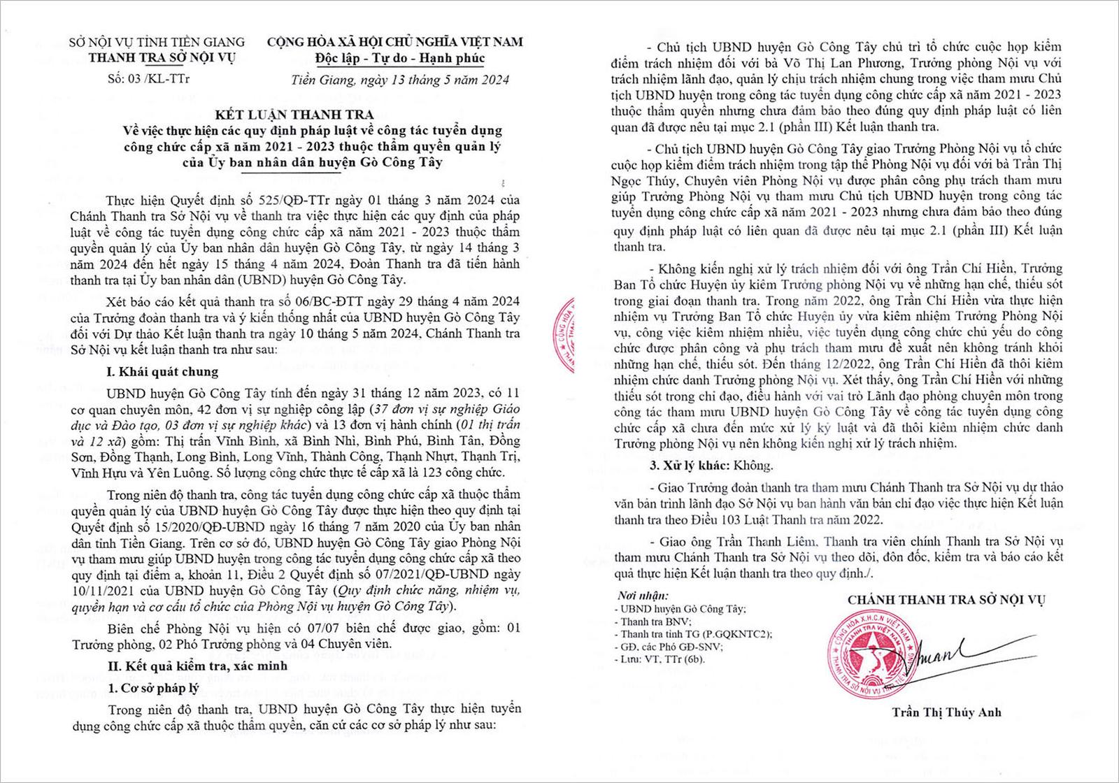 Thanh tra Sở Nội vụ tỉnh Tiền Giang đã công khai Kết luận thanh tra số 03/KL-TTr ngày 13/5/2024 về việc thực hiện các quy định pháp luật về công tác tuyển dụng công chức cấp xã năm 2021 - 2023 thuộc thẩm quyền quản lý của UBND huyện Gò Công Tây.
