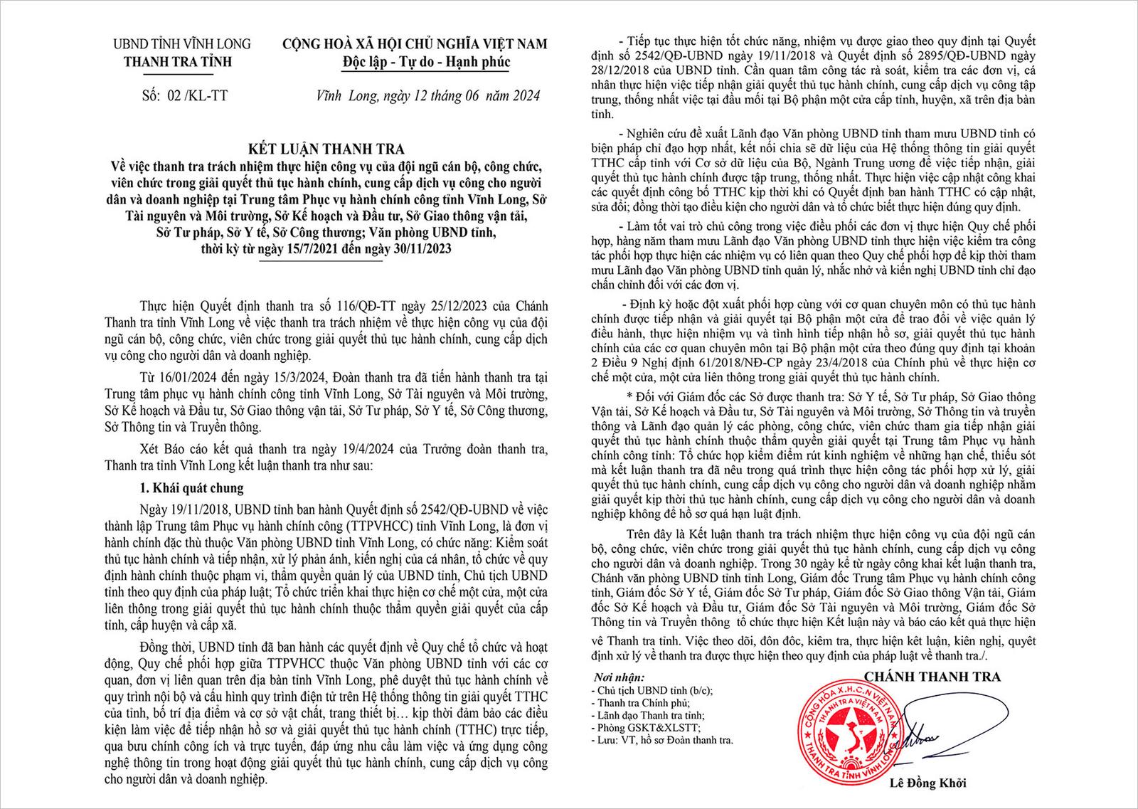 Kết luận thanh tra số 02/KL-TT ngày 12/6/2024 của Thanh tra tỉnh Vĩnh Long. Ảnh: CN