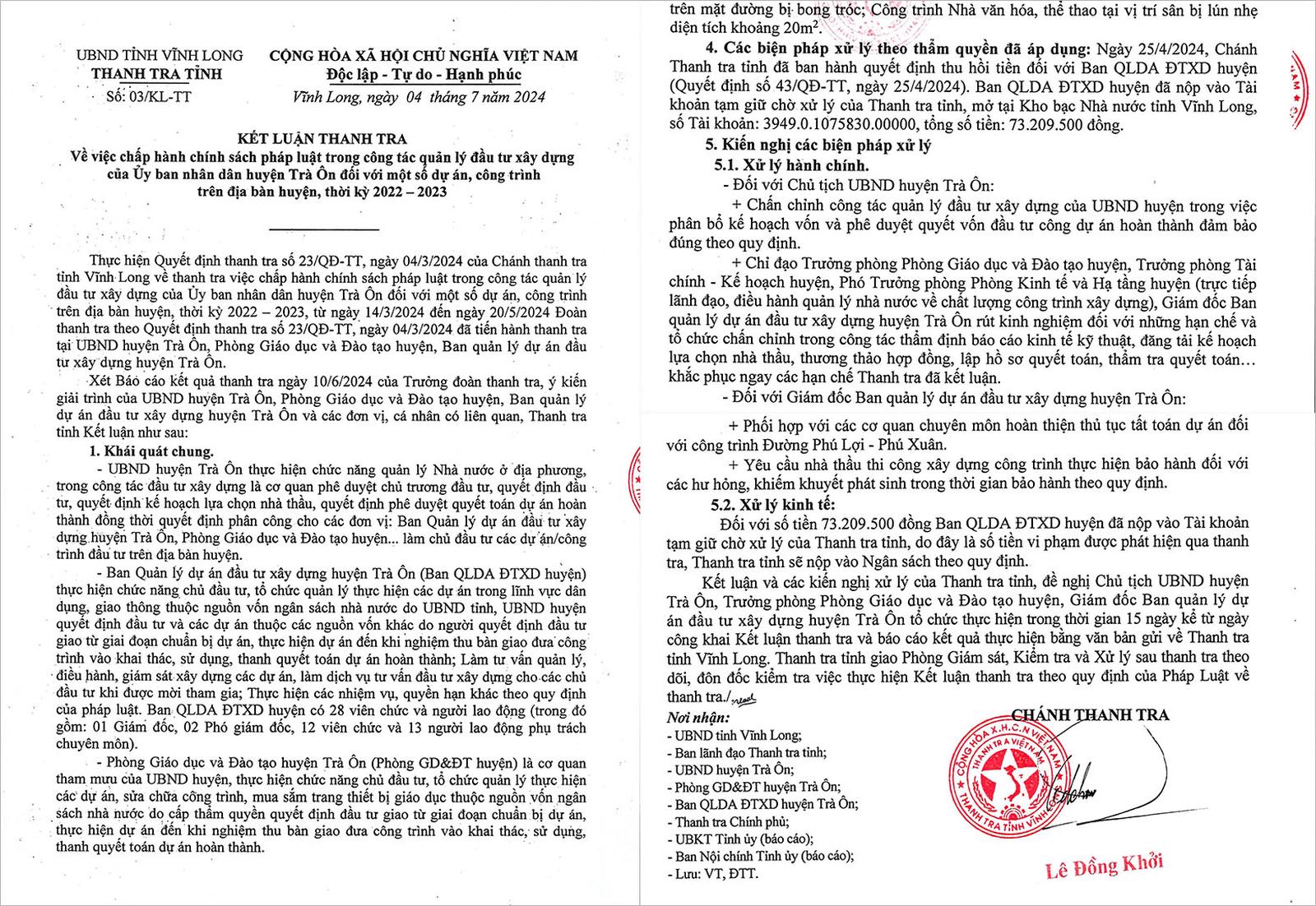 (Thanh tra) - Thanh tra tỉnh Vĩnh Long đã công khai Kết luận thanh tra số 03/KL-TT ngày 4/7/2024 về việc chấp hành chính sách, pháp luật trong công tác quản lý đầu tư xây dựng của UBND huyện Trà Ôn đối với một số dự án, công trình trên địa bàn, thời kỳ 2022 - 2023.
