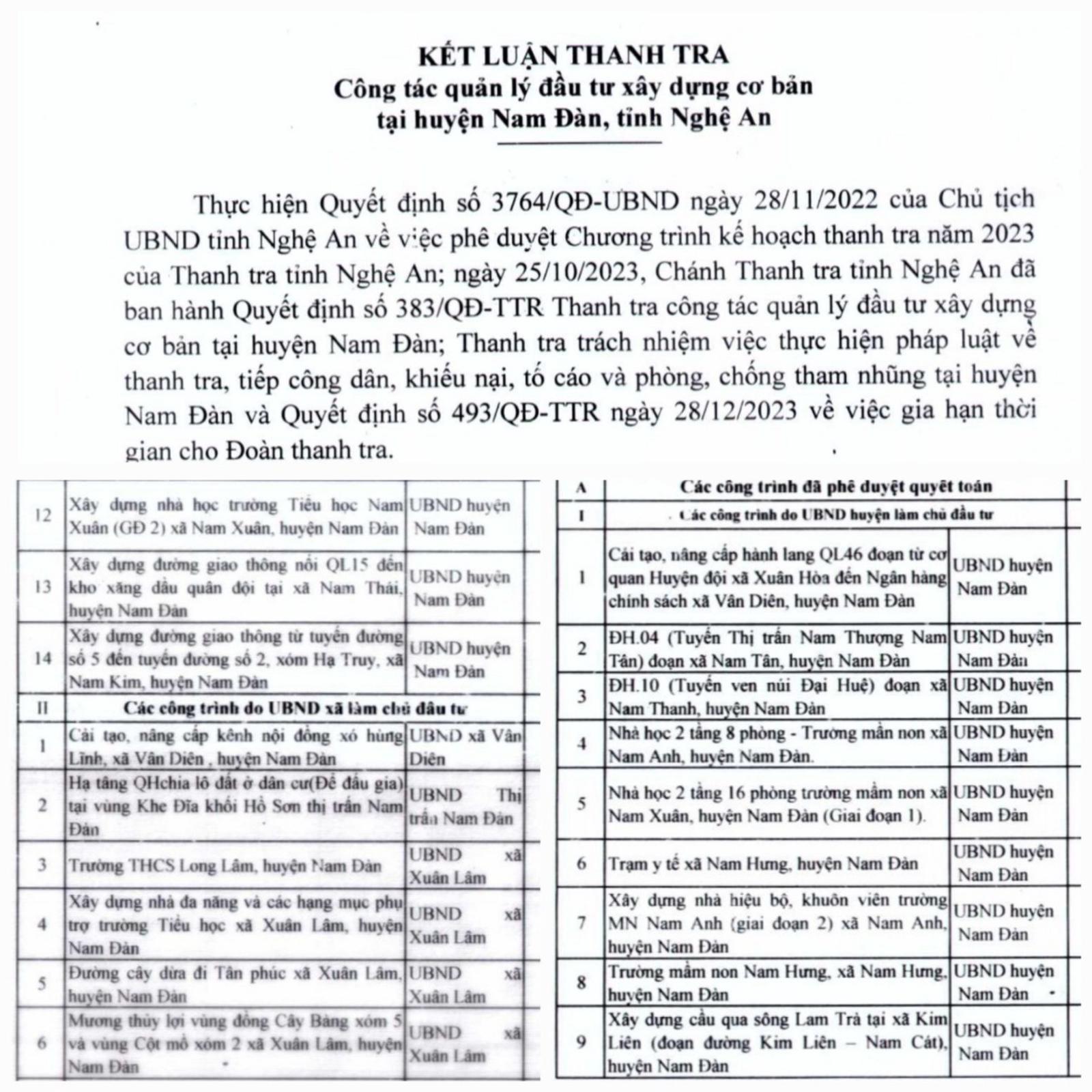 Theo Kết luận thanh tra số 08/KL-TTR ngày 5/2/2024 của Thanh tra tỉnh Nghệ An về thanh tra công tác quản lý đầu tư xây dựng cơ bản tại địa bàn huyện Nam Đàn, bên cạnh những kết quả tích cực, qua thanh tra đã phát hiện nhiều hạn chế, tồn tại khi tiến hành xây dựng công trình, dự án trên địa bàn huyện Nam Đàn.
