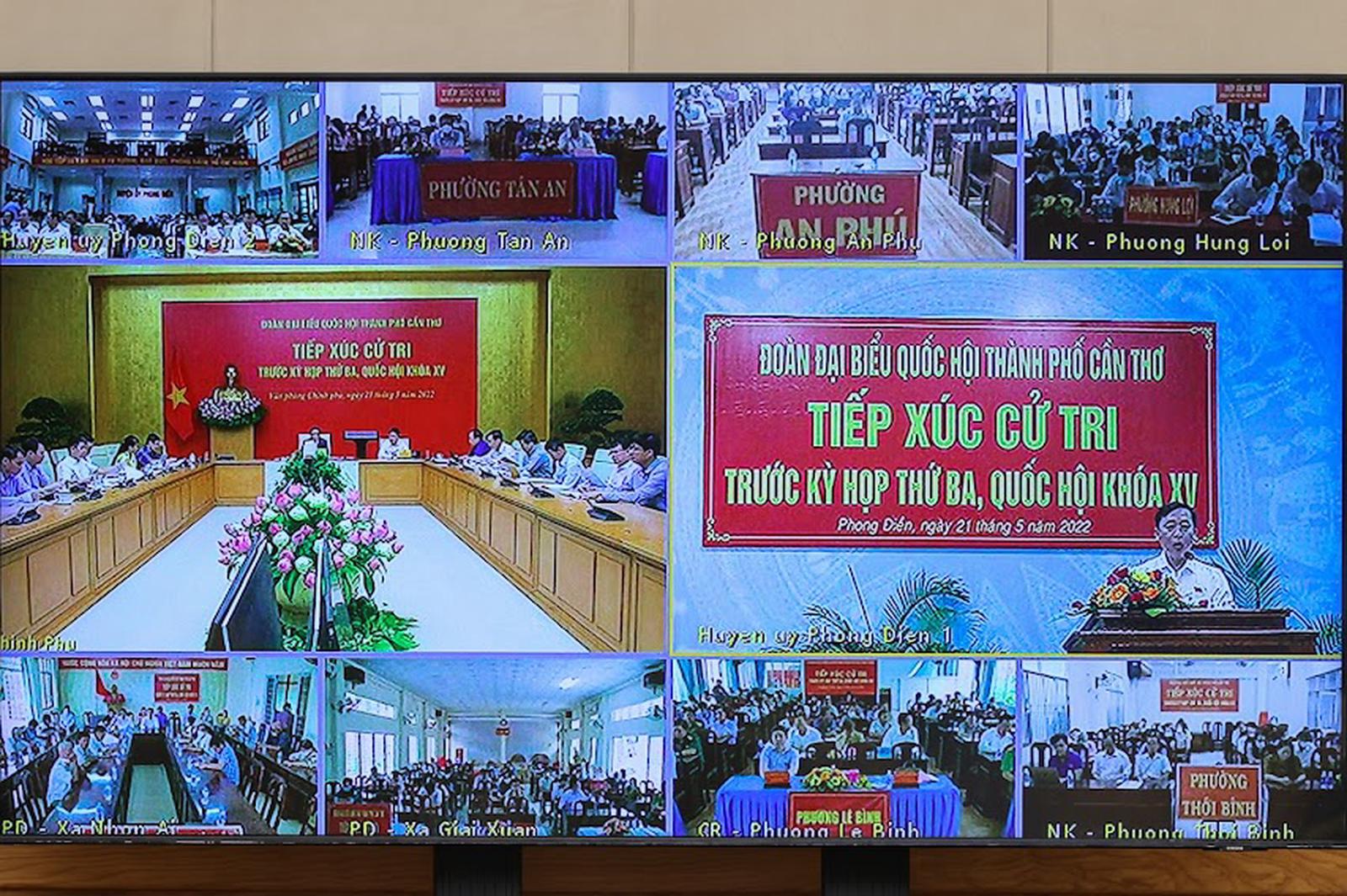 Cuộc tiếp xúc cử tri được kết nối giữa điểm cầu trụ sở Chính phủ với điểm cầu Hội trường huyện ủy Phong Điền, TP. Cần Thơ; các điểm cầu tại hội trường UBND của 25 xã, phường, thị trấn thuộc 9 quận, huyện của TP. Cần Thơ.