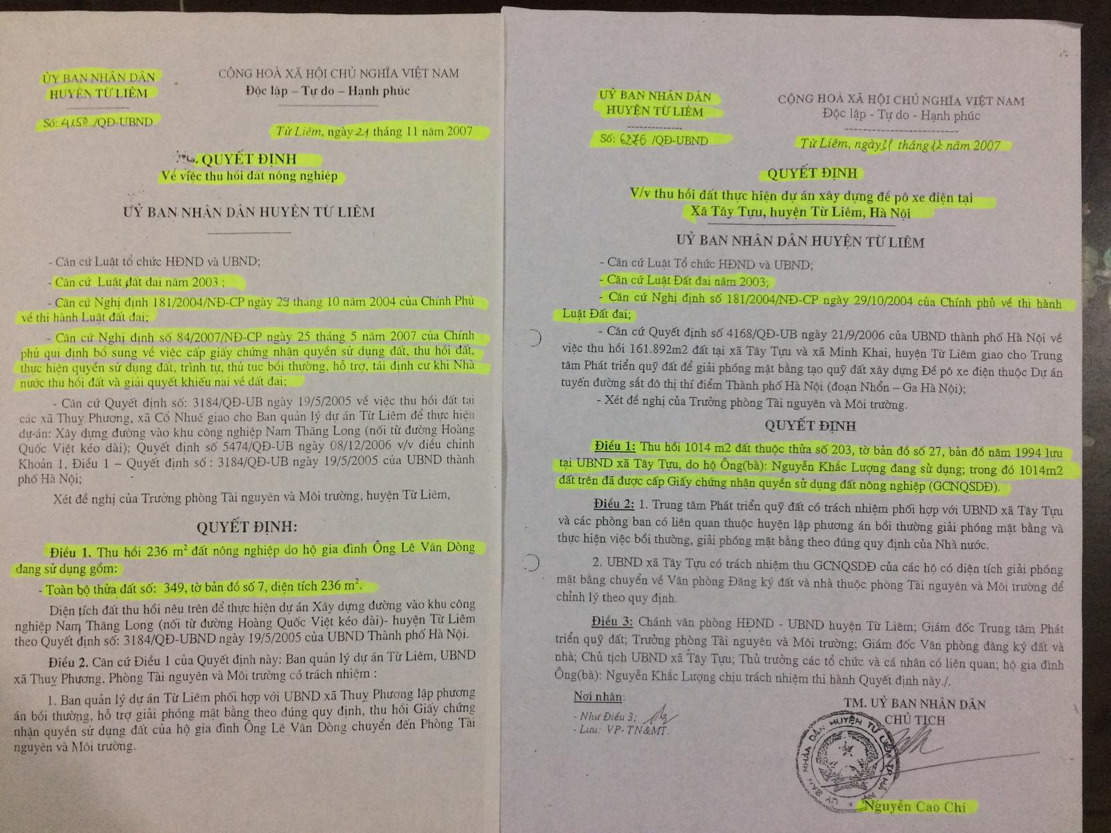 Với lí do “tế nhị” này mà ở các quyết định thu hồi đất sau đó vào ngày 31/12/2007 tại Dự án Đề - pô tuyến đường sắt đô thị thí điểm đoạn Nhổn - ga Hà Nội ở xã Tây Tựu và Minh Khai, UBND huyện Từ Liêm “cẩn thận” cắt bỏ Nghị định 84 ra khỏi phần căn cứ.