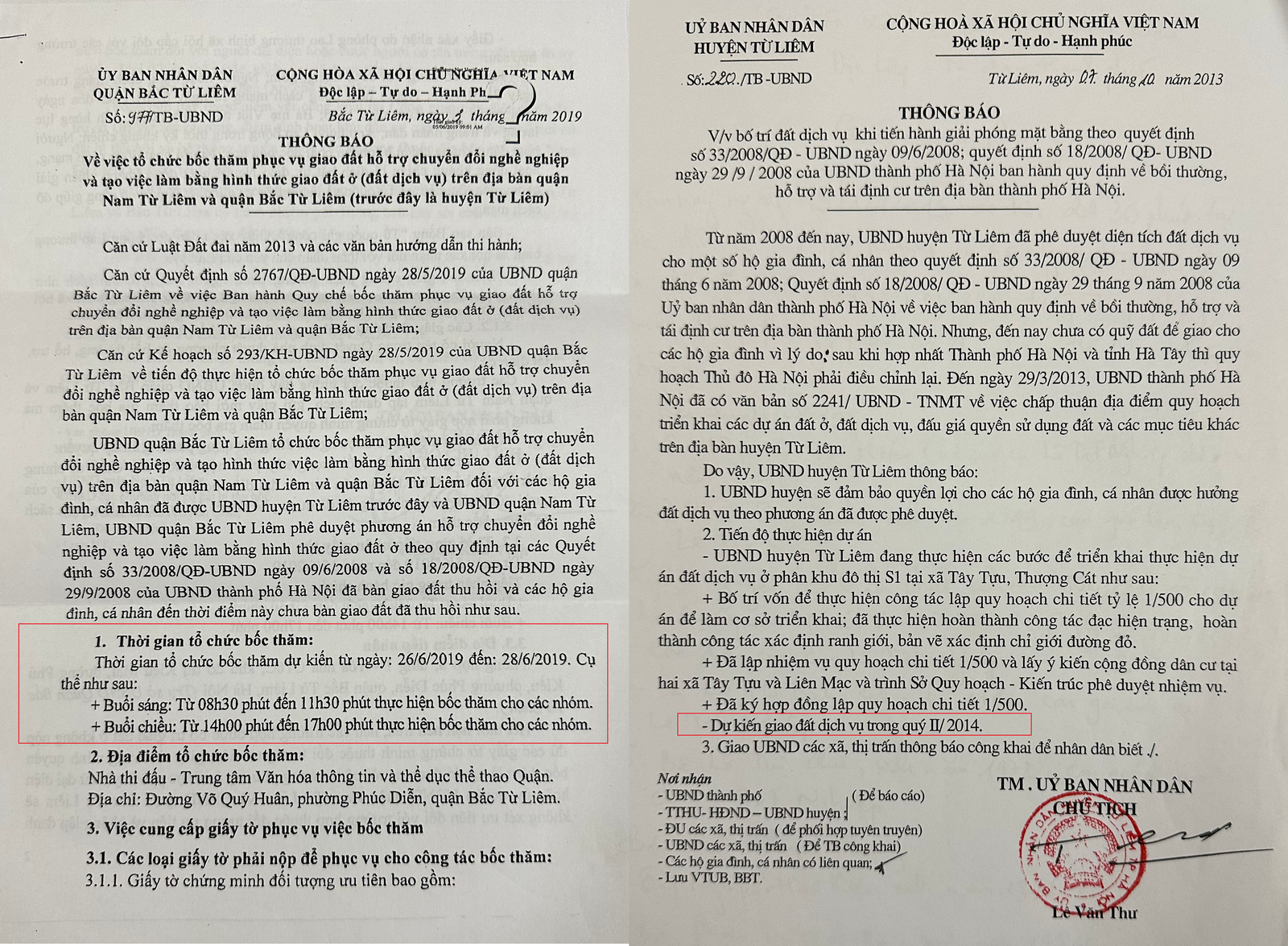 Ngày 07/10/2013, ông Lê Văn Thư, Chủ tịch UBND huyện Từ Liêm kí Thông báo số 220/TB-UBND cho biết dự kiến giao đất dịch vụ trong quý II/2014. Đến năm 2019, UBND quận Bắc Từ Liêm ra Thông báo số 977/TB-UBND về việc tổ chức bốc thăm giao đất hỗ trợ chuyển đổi nghề nghiệp và tạo việc làm bằng hình thức giao đất để ở (đất dịch vụ) trên địa bàn quận Nam Từ Liêm và quận Bắc Từ Liêm (trước đây là huyện Từ Liêm) với lịch dự kiến bốc thăm từ ngày 26/6/2019 đến 28/6/2019.