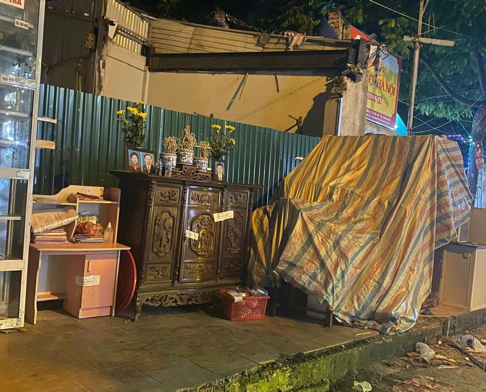 Ban thờ bố mẹ chồng và chồng chị Nguyệt tại vỉa hè khu đất bị cưỡng chế. Ảnh: Công Luận