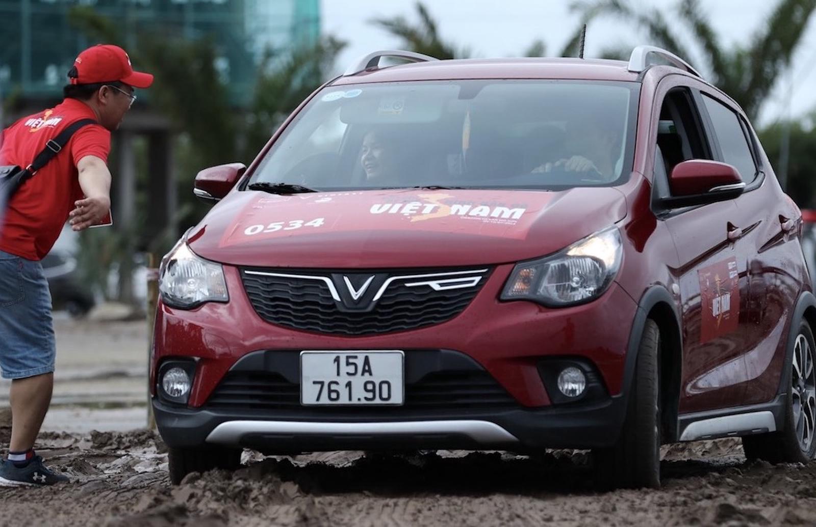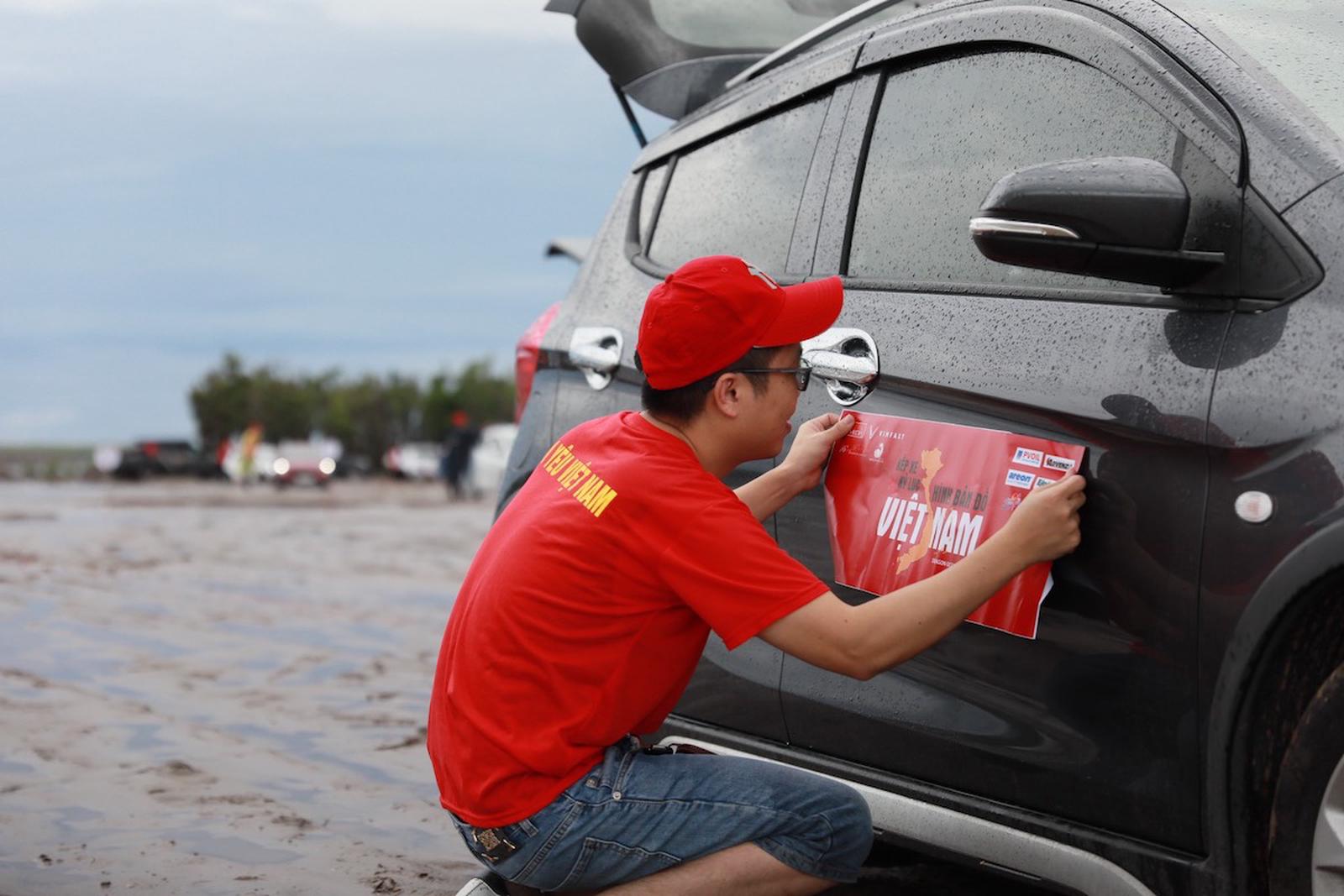 Một ô tô VinFast vào vị trí dưới sự hướng dẫn của ban tổ chức. Cơn mưa lớn đầu giờ sáng khiến điều kiện bãi tập kết không được như ý. Để hoàn thành đúng giờ, các chủ xe cũng như ban tổ chức đã phải làm việc vô cùng khẩn trương.