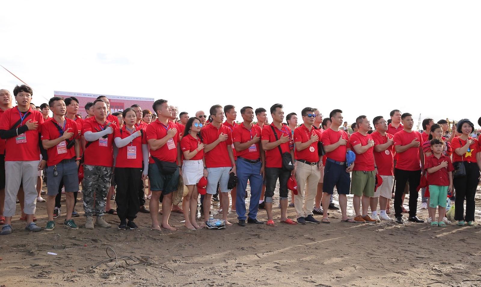 Khoảnh khắc lá quốc kỳ được kéo lên bằng dù động cơ. Không khí trở nên trang nghiêm khi tiếng nhạc Quốc ca hùng tráng vang lên. Hàng nghìn con người lặng phắc, mắt hướng lên bầu trời, tay đặt lên ngực trái.