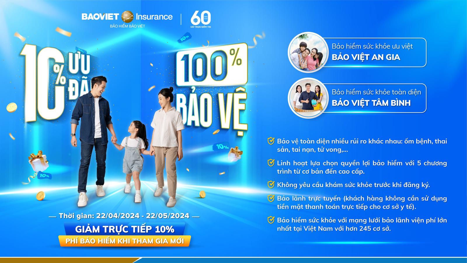 (Thanh tra)- Với mục tiêu khuyến khích cộng đồng chủ động chăm sóc sức khỏe cá nhân và gia đình, từ ngày 22/4/2024 đến ngày 22/5/2024, Bảo hiểm Bảo Việt triển khai chương trình khuyến mại “10% ưu đãi, 100% bảo vệ” áp dụng cho khách hàng tham gia chương trình bảo hiểm sức khỏe Bảo Việt An Gia và Bảo Việt Tâm Bình.