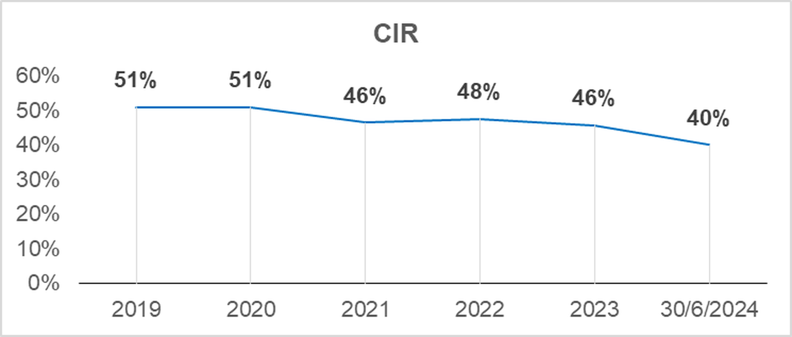 Tỷ lệ chi phí/tổng thu nhập hoạt động (CIR) tại NAB trong quý 2/2024 đã có sự cải thiện hiệu quả, CIR quý 2 về sát mốc 40% - mức thấp nhất trong 5 năm gần đây.