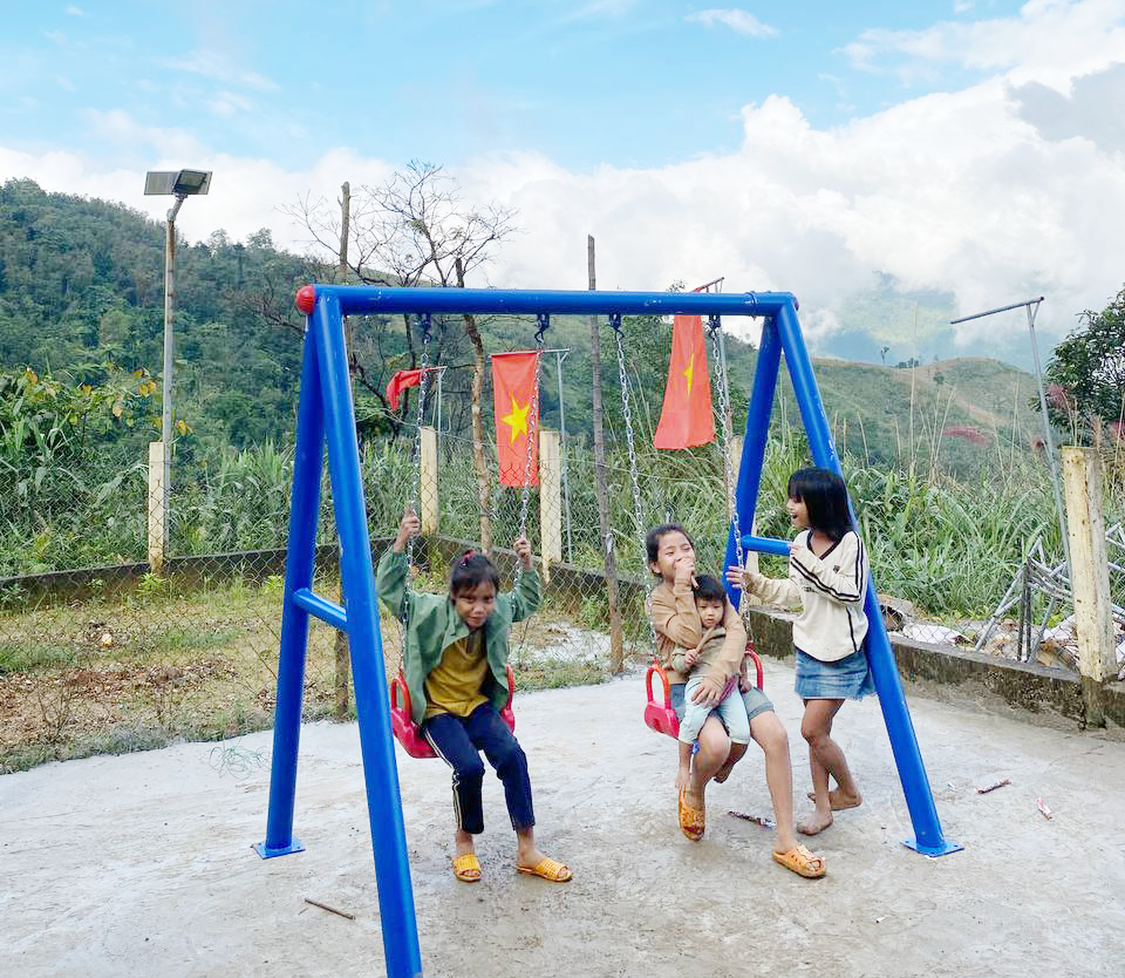 Các em nhỏ điểm trường Ông Bình vui chơi bên xích đu vừa được lắp đặt