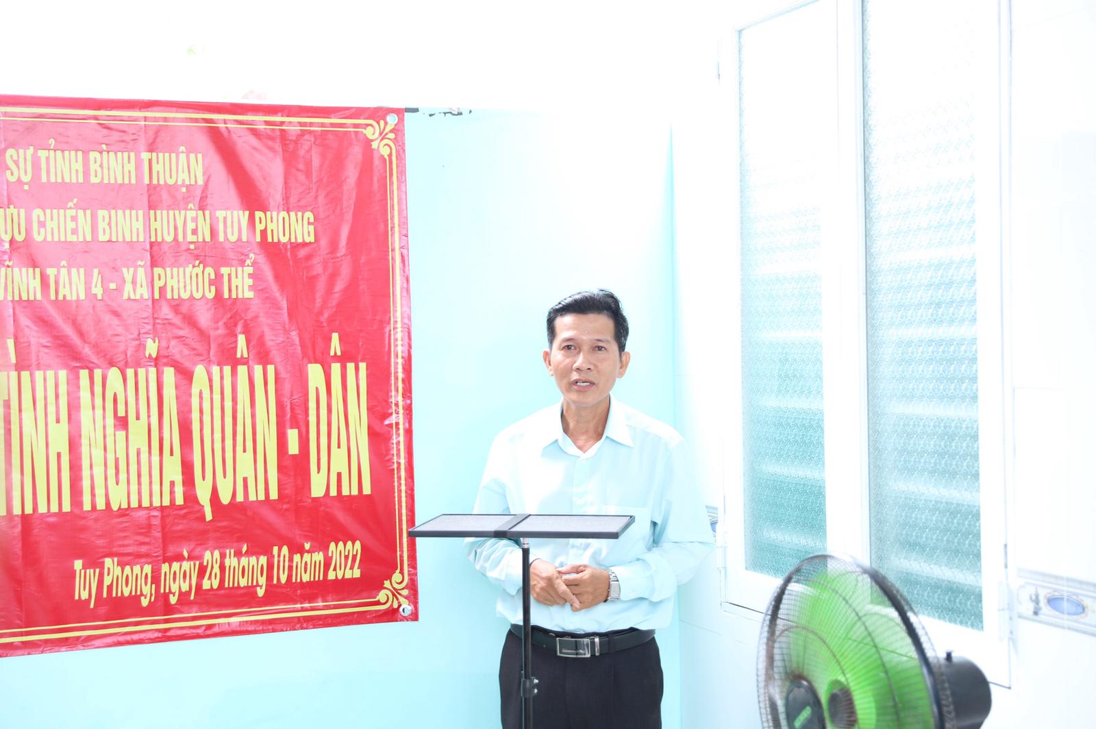 Phát biểu tại buổi Lễ bàn giao Nhà, ông Trần Ngọc Hưởng, Phó Giám đốc - Chủ tịch Công đoàn, đại diện Nhà máy Nhiệt điện Vĩnh Tân 4 cảm ơn địa phương, Ban Chỉ huy Quân sự huyện Tuy Phong và Hội Cựu Chiến binh huyện Tuy Phong đã tạo điều kiện để Nhà máy mang tấm lòng sẻ chia của CBCNV ngành điện đến với cựu chiến binh Huỳnh Văn Thái thông qua ngôi Nhà "Tình nghĩa Quân - Dân", mong gia đình cựu chiến binh Huỳnh Văn Thái sớm ổn định cuộc sống, tiếp tục cùng với Quân - Dân huyện Tuy Phong và CBCNV ngành điện ra sức xây dựng và bảo vệ quê hương Tuy Phong ngày càng giàu đẹp.