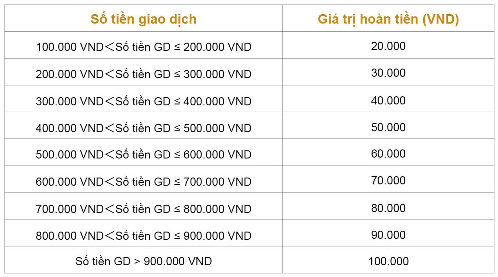 Bảng giá trị hoàn tiền theo giá trị giao dịch