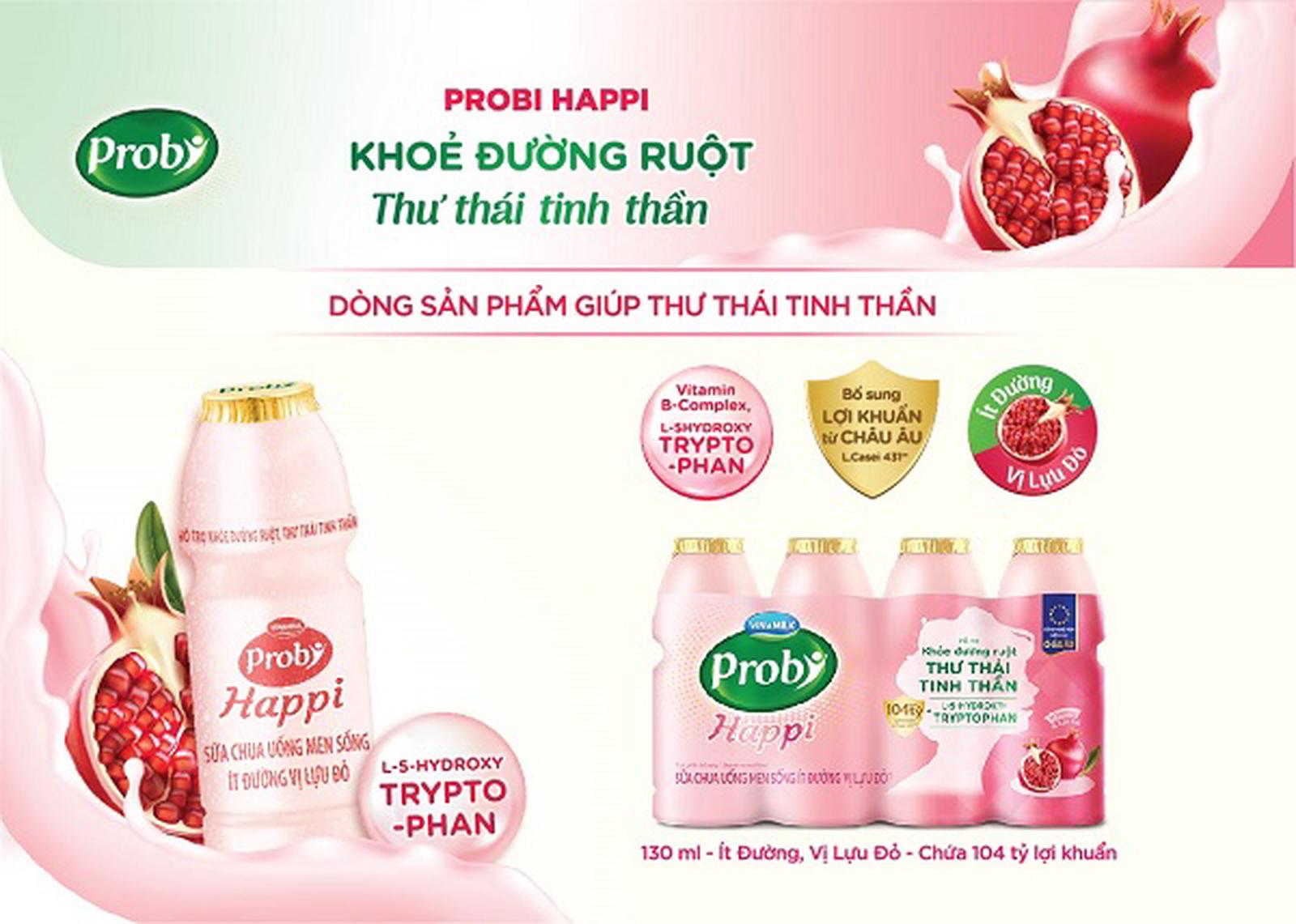 Hiện nay trên thị trường có dòng sữa chua uống men sống ít đường vị lựu đỏ Probi Happi chứa hàng tỷ lợi khuẩn L. Casei 431TM từ châu Âu tốt cho tiêu hóa, đồng thời bổ sung hoạt chất hạnh phúc L-5-hydroxytryptophan – tiền chất để sản sinh ra “nội tiết tố serotonin” giúp giải tỏa căng thẳng, cho tinh thần sảng khoái, vui vẻ hơn. Nên có thể nói đường ruột khỏe thì tâm trạng cũng được cải thiện.