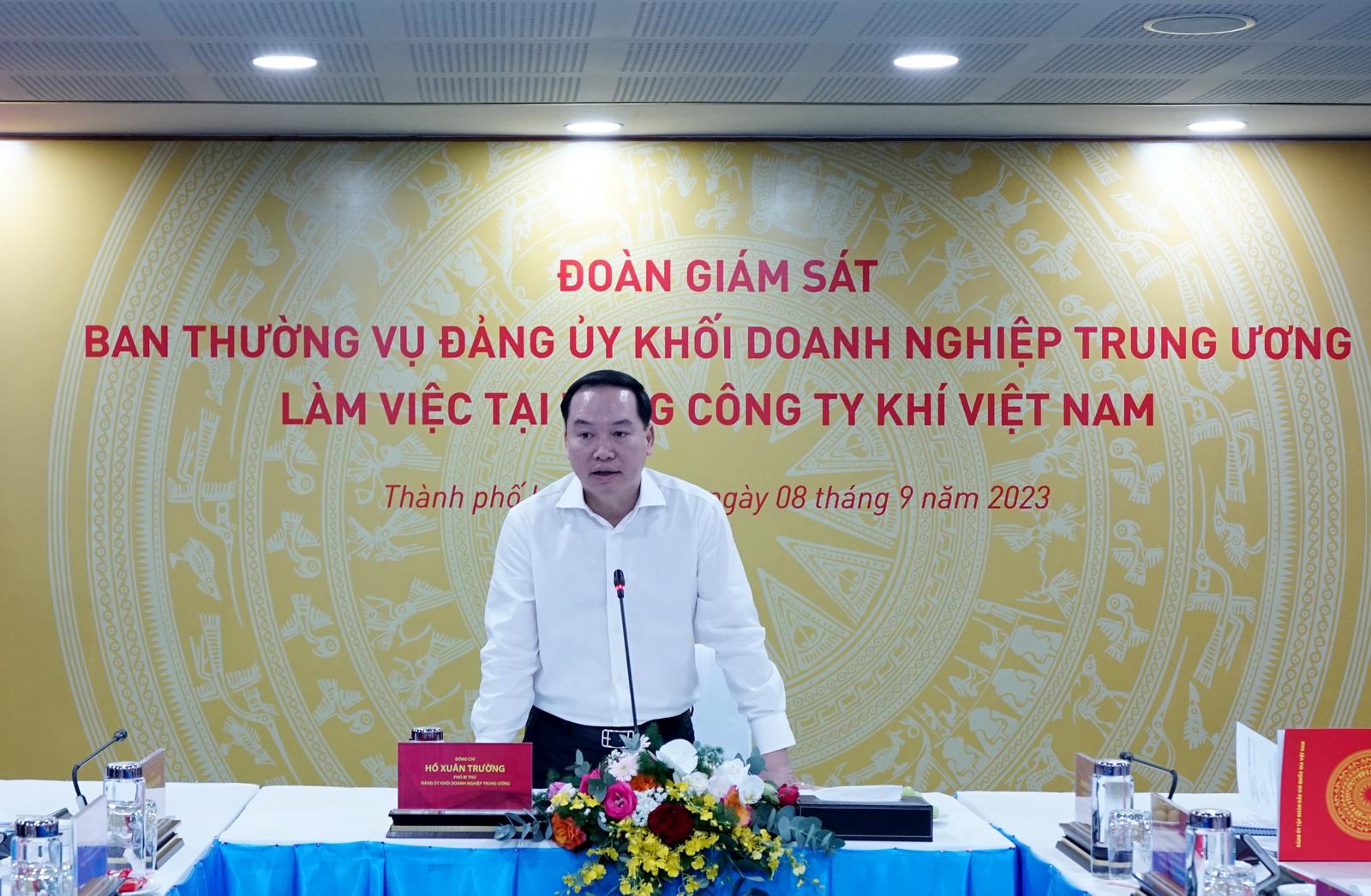 Thực hiện Quyết định số 1433-QĐ/ĐU ngày 3/8/2023 của Ban Thường vụ Đảng ủy Khối Doanh nghiệp Trung ương (Ban Thường vụ Đảng ủy Khối), ngày 8/9/2023, tại trụ sở làm việc của PV GAS, Đoàn giám sát do đồng chí Hồ Xuân Trường, Phó Bí thư Đảng ủy Khối làm Trưởng đoàn đã tiến hành giám sát chuyên đề đối với Đảng ủy, Ban Thường vụ Đảng ủy PV GAS đối với 03 nội dung: