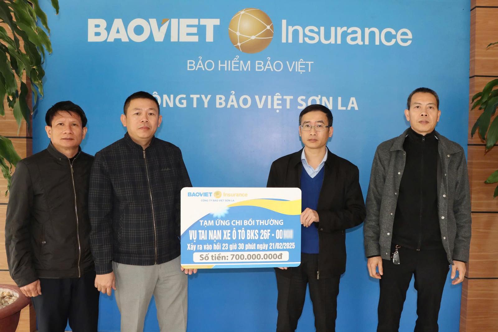 Nhằm động viên và chia sẻ với khách hàng trước những tổn thất, Công ty Bảo Việt Sơn La thực hiện tạm ứng chi phí bồi thường cho vụ tai nạn giao thông nói trên với tổng số tiền là 700 triệu đồng. Đại diện Công ty Bảo Việt Sơn La phối hợp cùng chủ xe khách 26F-009.XX để thực hiện việc tạm ứng, chi trả bồi thường nhằm nhanh chóng khắc phục hậu quả tai nạn, hỗ trợ gia đình các nạn nhân theo quy định tại Nghị định số 67/2023/NĐ-CP về bảo hiểm bắt buộc trách nhiệm dân sự chủ xe cơ giới và hợp đồng bảo hiểm đã ký kết một cách nhanh nhất.