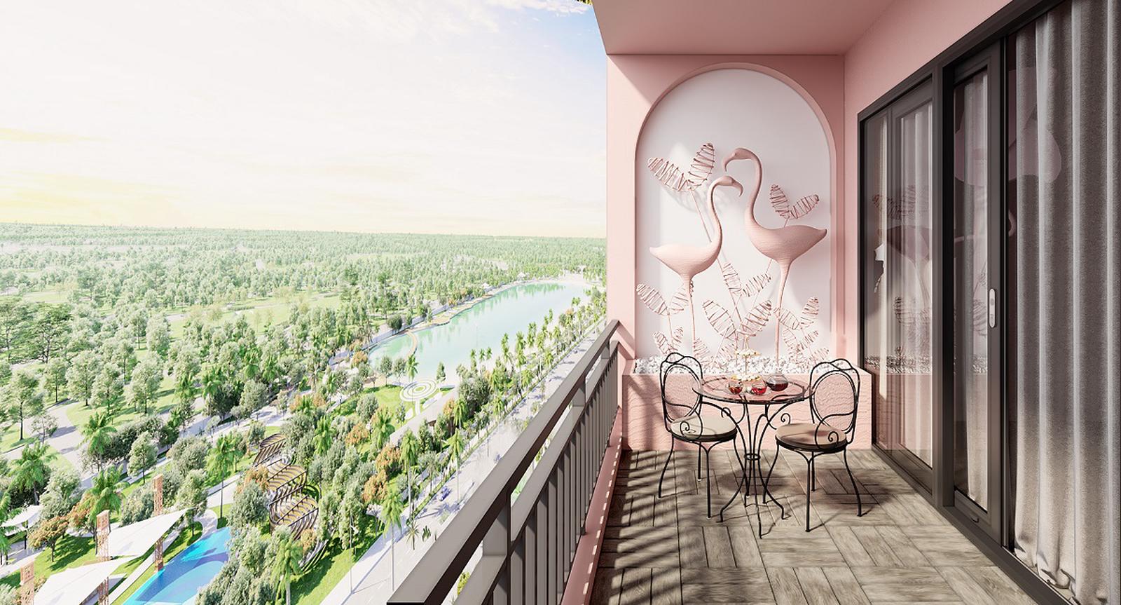 Bất kể từ vị trí nào, chỉ cần đứng từ ban công hay từ cửa sổ phòng ngủ kính chạm sàn, những cư dân trẻ có thể phóng tầm mắt ra xa, tận hưởng bình minh trong mát trên tán cây xanh mướt và hồ nước lấp lánh màu nắng hay ngắm trọn bức tranh đêm lung linh ánh đèn trên dãy dừa cạn trên cát trắng, bên mạn hồ.