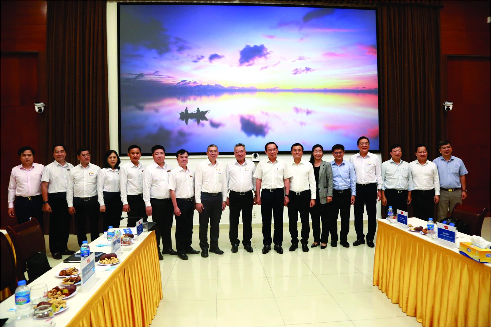 Bí thư Thành uỷ TP Nguyễn Văn Nên (đứng thứ 8 từ phải qua) chụp hình lưu niệm cùng Lãnh đạo Tổng Công ty và đoàn công tác