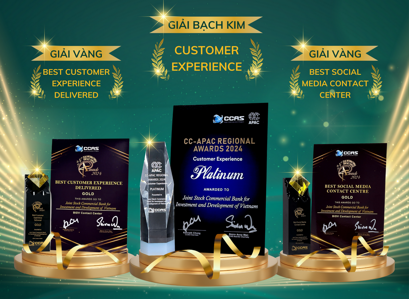(Thanh tra) - Với những nỗ lực đổi mới sáng tạo không ngừng để mang đến trải nghiệm khách hàng vượt trội, Ngân hàng TMCP Đầu tư và Phát triển Việt Nam (BIDV) đã nhận 03 giải thưởng quốc tế: Giải Bạch Kim hạng mục "Trải nghiệm khách hàng xuất sắc" do Hiệp hội Contact Centre Châu Á - Thái Bình Dương (CC-APAC) trao tặng và 02 Giải Vàng hạng mục "Trải nghiệm khách hàng tốt nhất" và "Contact Centre cung cấp dịch vụ mạng xã hội tốt nhất" do Hiệp hội Contact Centre Singapore (CCAS) trao tặng.