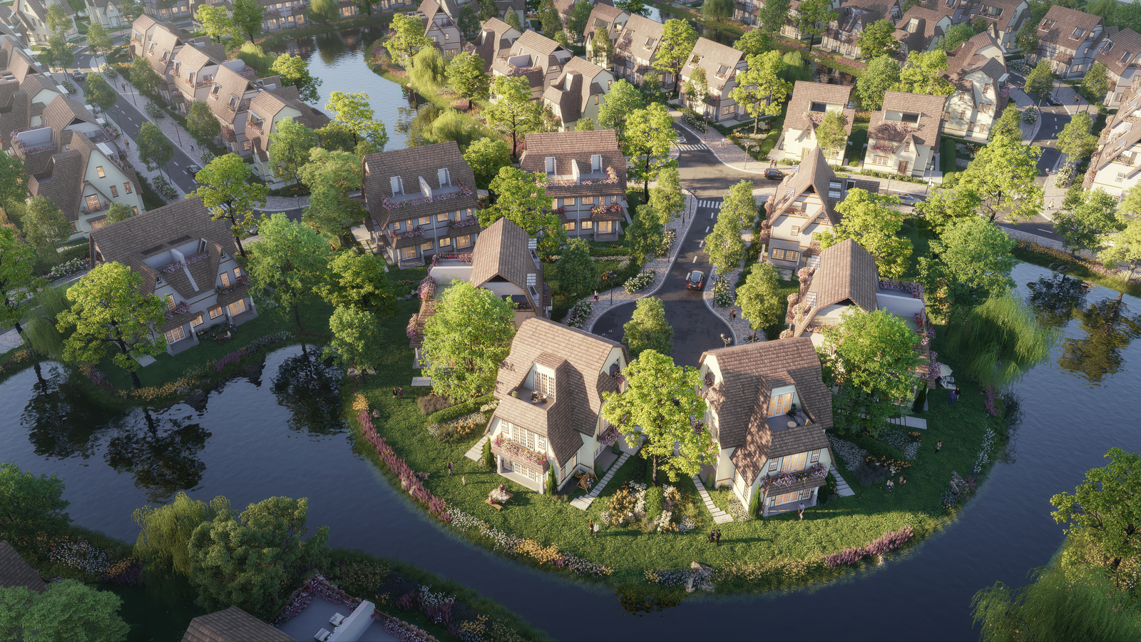 “Các nhánh đảo trên cụm đảo không bố trí thẳng tắp từ trong ra ngoài mà được uốn cong để tạo tầm view đẹp mắt cho những căn tại vị trí đường cong nhưng vẫn đảm bảo tính riêng tư cho những biệt thự ở phía sau điểm uốn cong đó đồng thời tạo được 1 khu vườn chủ đề để kết nối cư dân. Cứ 5 nhánh đảo ở gần nhau sẽ có độ dài ngắn, so le khác nhau giúp tầm view của nhà này không trực diện vào nhà khác. Quy hoạch của Đảo Châu Âu không tạo ra từ những thước đo công nghiệp, mà dựa trên tâm lý và hành vi của người sử dụng. Như vậy, mỗi căn nhà có chất lượng tầm view dài 10m, 20m, 50m thì tương tự như giá trị sử dụng trên lô đất rộng 1000 – 2000m2”, ông Nguyễn Đức Cảnh- Phó tổng giám đốc Eco Central Park chia sẻ về thiết kế nhánh, cụm đảo.