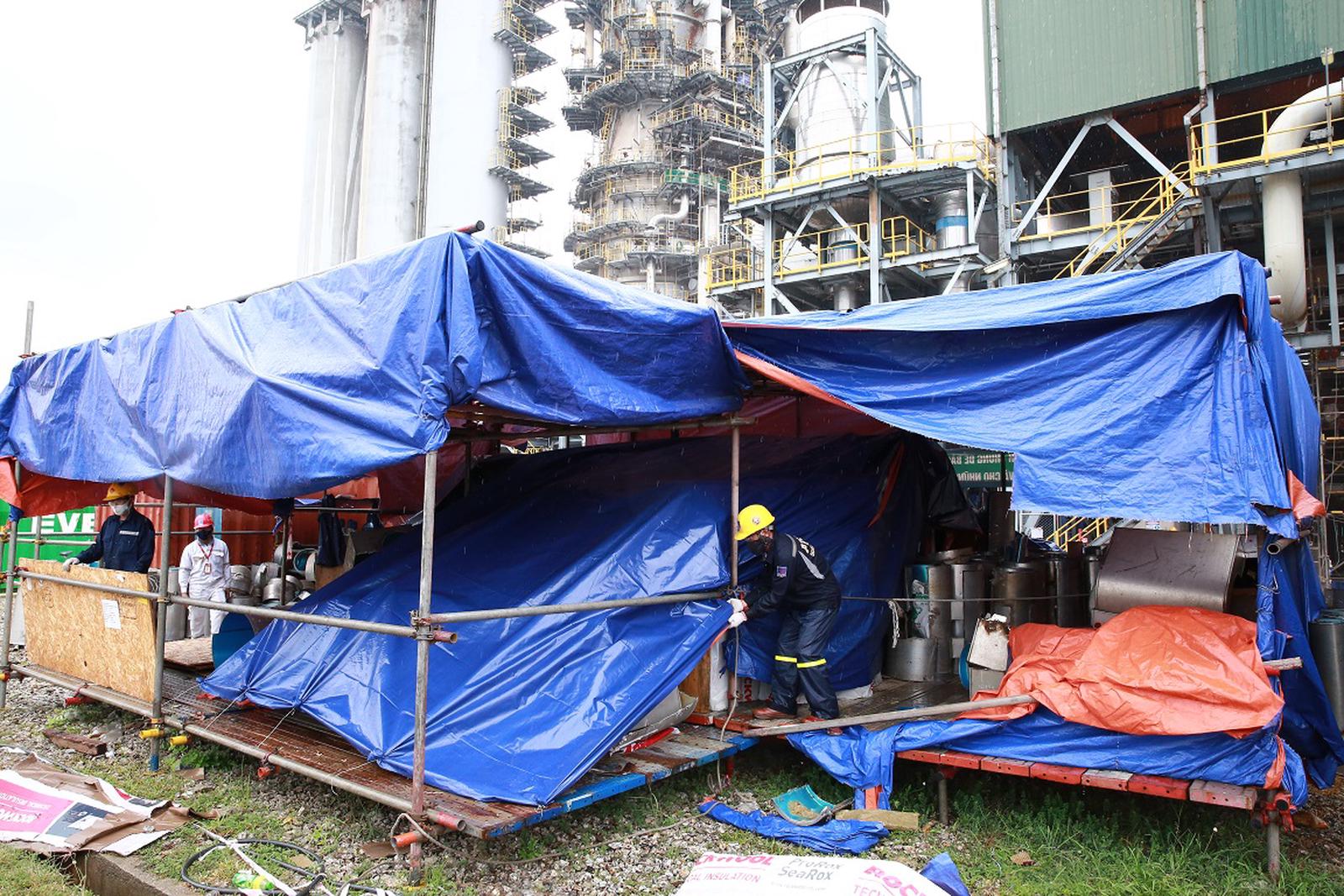 Ban An toàn Môi trường làm đầu mối phối hợp nhà thầu triển khai kiểm tra, thông thoát hệ thống nước mưa, hệ thống xử lý nước thải trong Nhà máy; kiểm tra, che chắn hệ thống điện tạm cho công tác BDTT; Che chắn gia cố những vật dụng, thiết bị dễ bay, ngã đổ; Quản lý vật tư trang thiết bị bảo dưỡng; thông báo tàu thuyền các nhà thầu phương án neo đậu an toàn; Kiểm tra và đóng tất cả các van trên hệ thống xuất sản phẩm, chốt các van cơ khí cần xuất, chốt các van an toàn chống bão cần xuất trước khi bão đến.