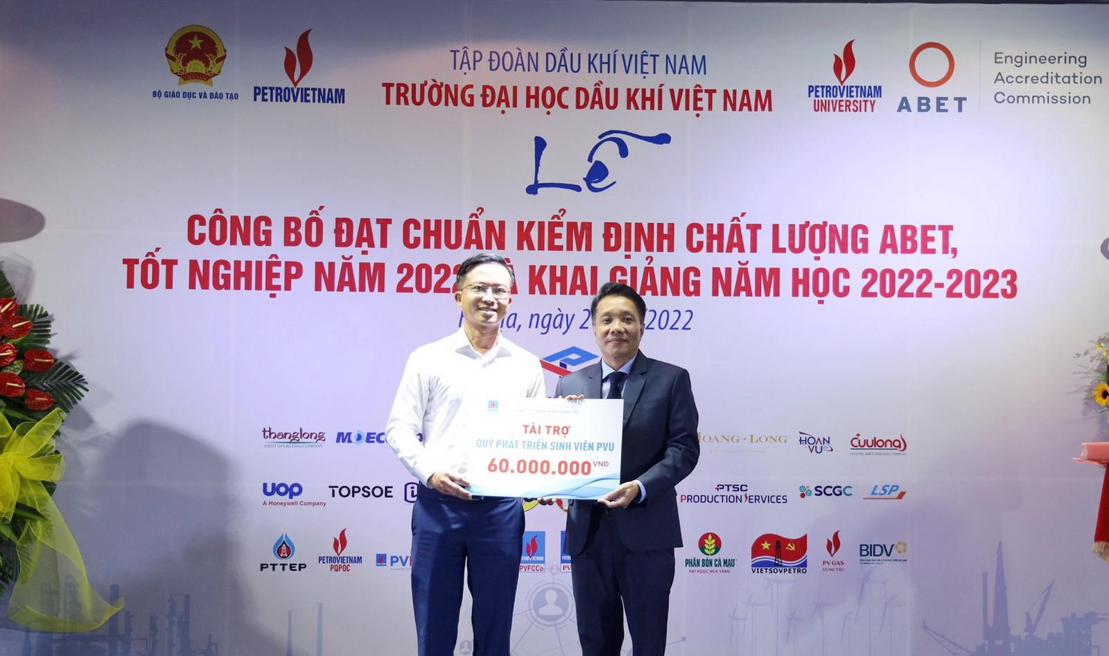 Ngày 28/10/2022, Công ty Chế biến Khí Vũng Tàu (KVT) đã tham dự “Lễ Công bố đại chuẩn kiểm định chất lượng ABET - Trao bằng tốt nghiệp 2022 và Khai giảng năm học mới 2022-2023” của PVU. Tại đây, KVT đã trao học bổng cho các sinh viên, khuyến khích tài năng có thành tích học tập xuất sắc, sinh viên nghèo vượt khó học giỏi, có ý chí vươn lên trong học tập và cuộc sống.