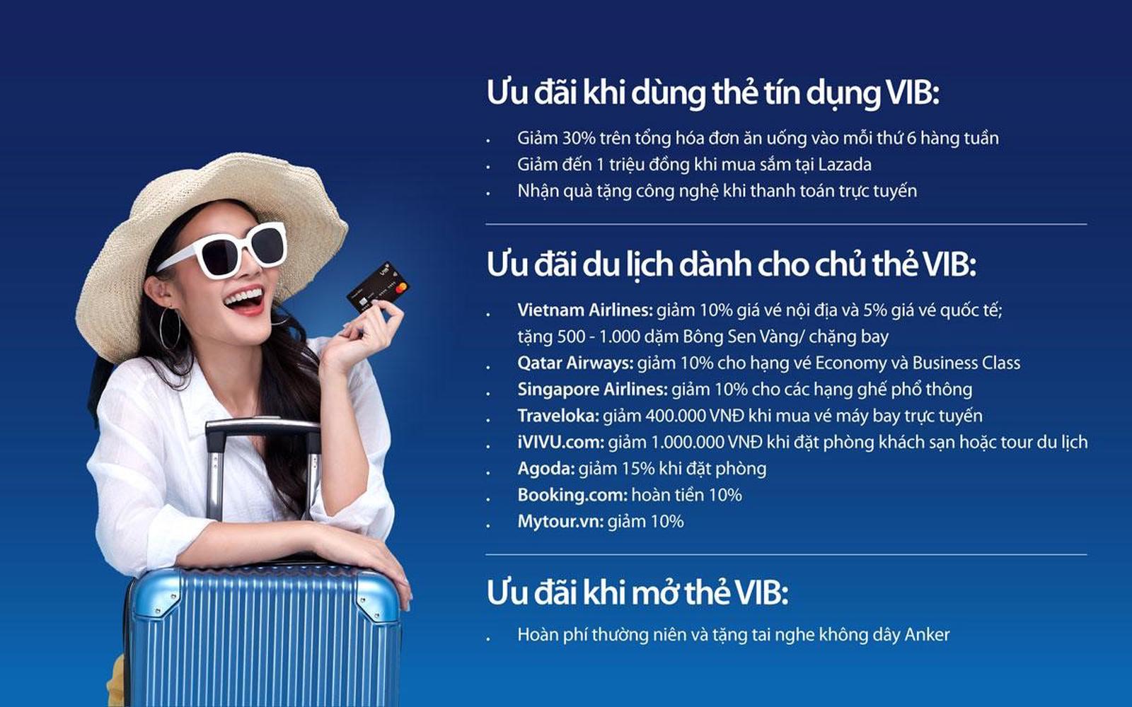 Từ nay đến hết ngày 31/12/2023, khách hàng sẽ được giảm 30% trên tổng hóa đơn ăn uống (tối đa 300 nghìn đồng) tại một số chuỗi nhà hàng thuộc hệ thống Golden Gate Group (Kichi-Kichi, Manwah, Hutong, K-Pub) khi thanh toán qua thẻ tín dụng VIB, áp dụng vào mỗi thứ 6 hàng tuần. Với các chi tiêu trực tuyến, người dùng có thể được giảm đến 1 triệu đồng khi mua sắm tại Lazada bằng thẻ tín dụng VIB và nhận được nhiều quà tặng công nghệ giá trị như: 3 điện thoại iPhone 15 Pro Max 256GB, 450 robot hút bụi Anker Eufy 11S, 750 loa Anker Soundcore Marvel, 7.500 sạc dự phòng Anker và 15.000 e-voucher 100k. Từ ngày 15/12/2023 đến ngày 15/02/2024, chủ thẻ tín dụng VIB khi mua vé Vietnam Airlines sẽ được giảm ngay 10% giá vé nội địa và 5% giá vé quốc tế. Riêng chủ thẻ Premier Boundless - thẻ đồng thương hiệu của VIB và Vietnam Airlines, với mỗi giao dịch mua vé từ 5 triệu đồng trong thời gian này sẽ được tặng thêm 500 - 1.000 dặm Bông Sen Vàng/1 chặng bay. Các khoản chi tiêu này còn được quy đổi thành 1-2 dặm thưởng cho mỗi 30.000 VNĐ chi tiêu trong nước và cho mỗi 20.000 VNĐ chi tiêu tại Vietnam Airlines, dùng để đổi vé máy bay hoặc nâng cấp hạng ghế cho các chuyến kế tiếp. Bên cạnh đó, nhiều ưu đãi khác sẽ giúp chuyến đi của bạn thêm phần tiết kiệm khi dùng thẻ VIB như: giảm đến 10% với vé hạng Economy và Business Class cho tất cả chuyến bay Qatar Airways; giảm 10% cho các hạng ghế phổ thông của Singapore Airlines; giảm 400.000 VNĐ khi thanh toán trực tuyến đặt vé máy bay tại Traveloka; giảm 15% khi đặt phòng tại Agoda; hoàn tiền 10% tại Booking.com; giảm 10% tại Mytour.vn; giảm 1.000.000 VNĐ khi đặt phòng khách sạn hoặc tour du lịch trên iVIVU.com Đón đầu nhu cầu sử dụng thẻ tăng cao trong dịp cuối năm, VIB tăng mạnh các ưu đãi cho khách hàng khi mở thẻ mới. Khách hàng sẽ được hoàn phí thường niên năm đầu nếu thỏa điều kiện chi tiêu thẻ 1-20 triệu đồng và trọn đời nếu chi tiêu 60-100 triệu đồng (tùy vào dòng thẻ) trong 30 ngày mở thẻ, đồng thời nhận thêm tai nghe không dây Anker cho giao dịch 1 triệu đầu tiên.