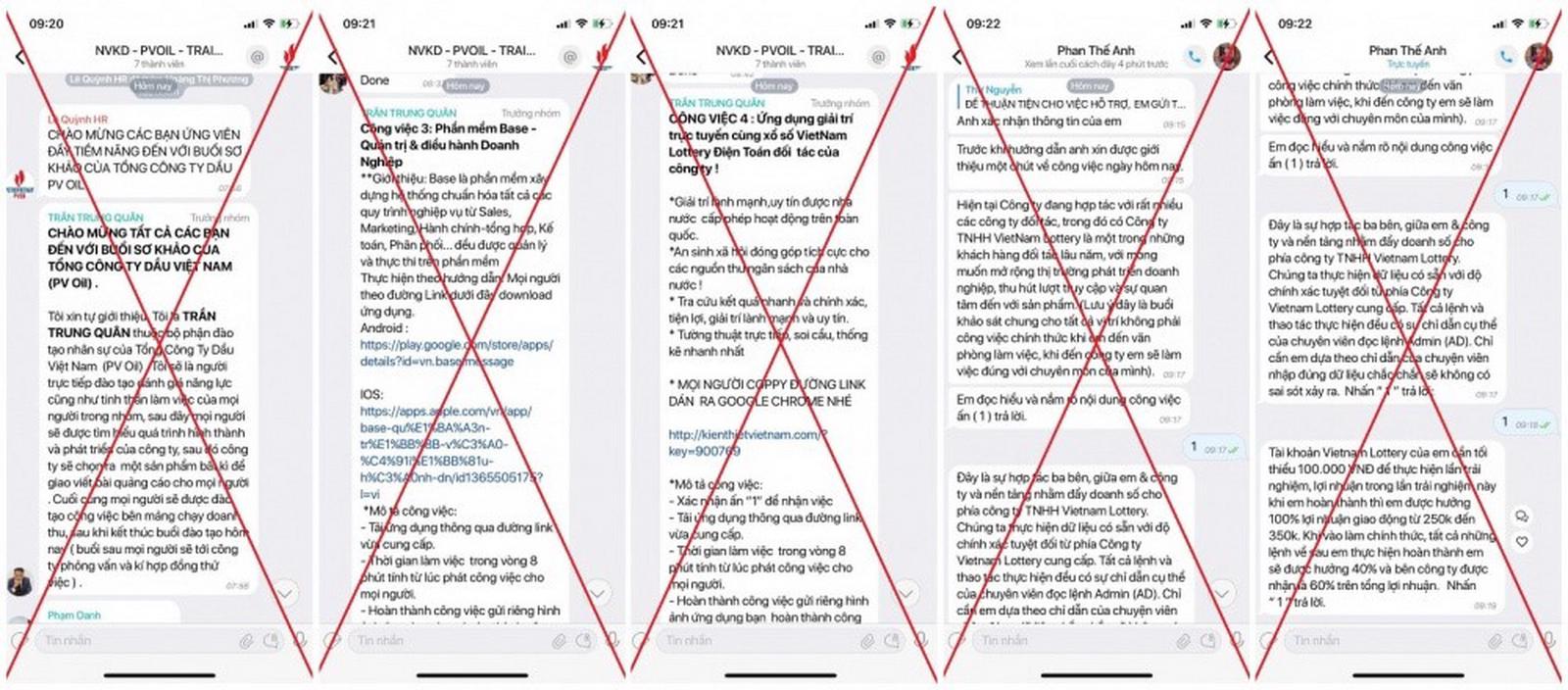 Các thủ đoạn phổ biến mà những kẻ này sử dụng đó là kêu gọi đầu tư, giao dịch chuyển khoản, gia nhập vào các nhóm xổ số, tải các nền tảng ứng dụng để kiểm tra, khảo sát năng lực, nhận quà tặng… Ngoài ra, những kẻ mạo danh còn yêu cầu ứng viên tham gia vào nhiều hội, nhóm chat trên nhiều nền tảng khác nhau như WhatsApp, Telegram, Zalo... để thực hiện phỏng vấn; yêu cầu ứng viên tải thêm nhiều ứng dụng khác, tạo tài khoản trên các trang web xổ số, các trang thương mại điện tử… để thực hiện chuyển tiền trực tuyến vào tài khoản của các tổ chức, cá nhân mạo danh.