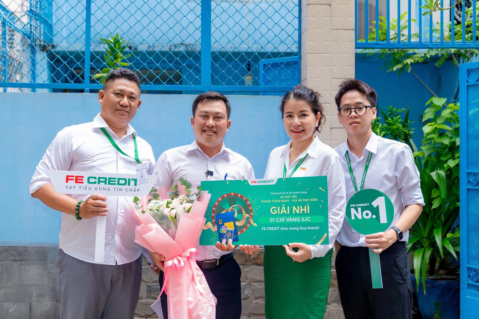 Đại diện FE CREDIT chia sẻ niềm vui với khách hàng khi nhận giải thưởng.