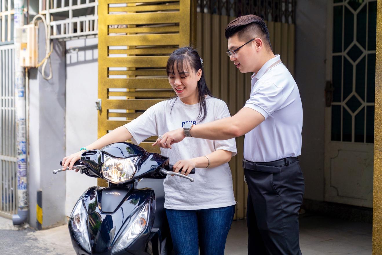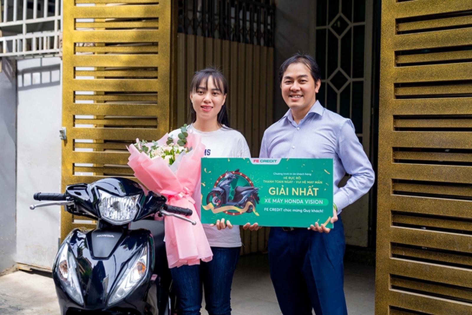 Chị Kim Ngân – vợ anh Nguyễn Văn Đệ – nhận giải nhất là một chiếc Honda Vision từ đại diện FE CREDIT. Ảnh: FE CREDIT.