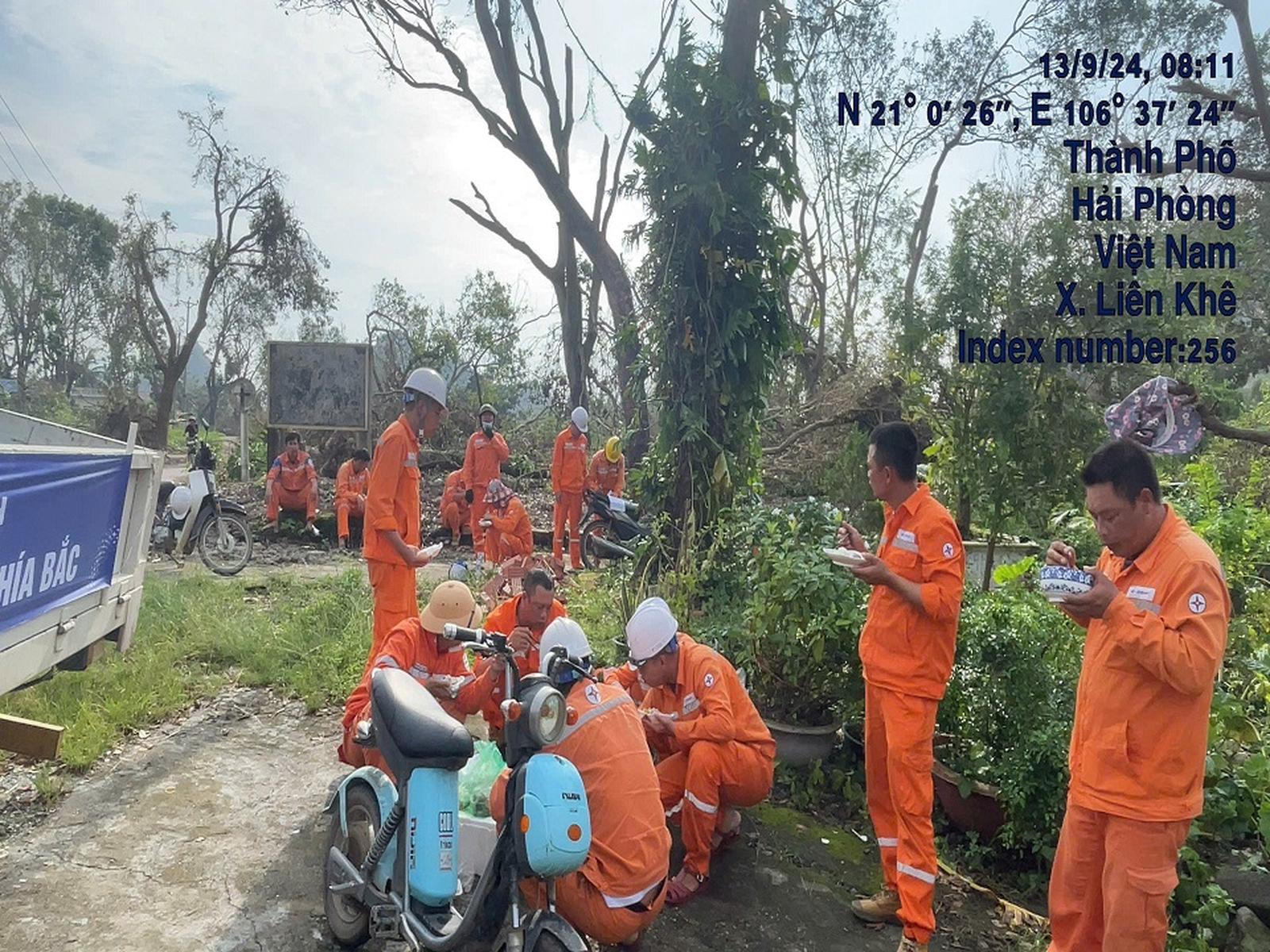 Đội xung kích tại Hải Phòng tranh thủ ăn cơm ngay tại hiện trường để tiếp tục làm thông trưa, kịp thời đóng điện phục vụ nhân dân