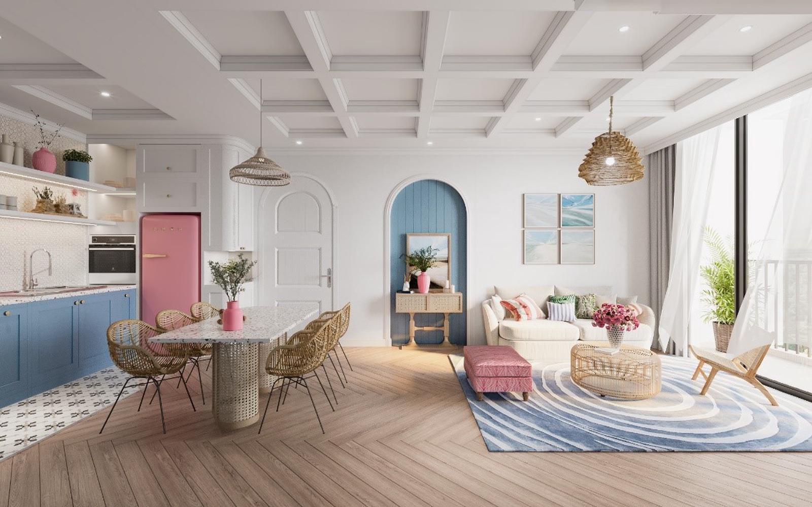 Thiết kế liên hoàn giữa phòng bếp, phòng ăn và phòng khách trong diện tích 26m2 giúp căn hộ trở nên rộng, thoáng. Lựa chọn thêm phong cách nội thất hiện đại với màu sắc chủ đạo là trắng và hồng, xanh pastel sẽ làm không gian trở nên vô cùng tươi mát, dễ chịu.