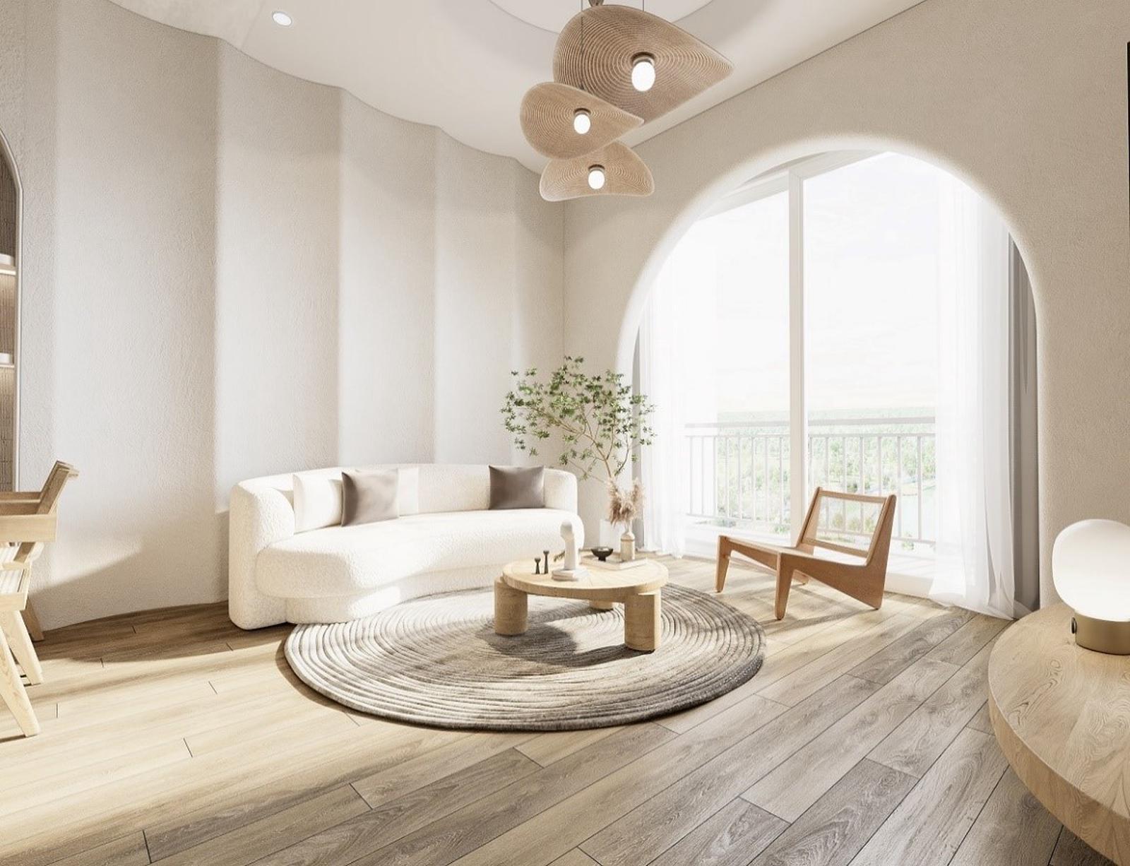 Khu vực phòng khách nối liền ra ban công, gia chủ có thể cách điệu ô kính vuông bằng khung vòm và lựa chọn những set đồ phòng khách mềm mại, trang nhã, đậm chất Á Đông, mang đến một không gian vô cùng nhẹ nhàng, thư thái.