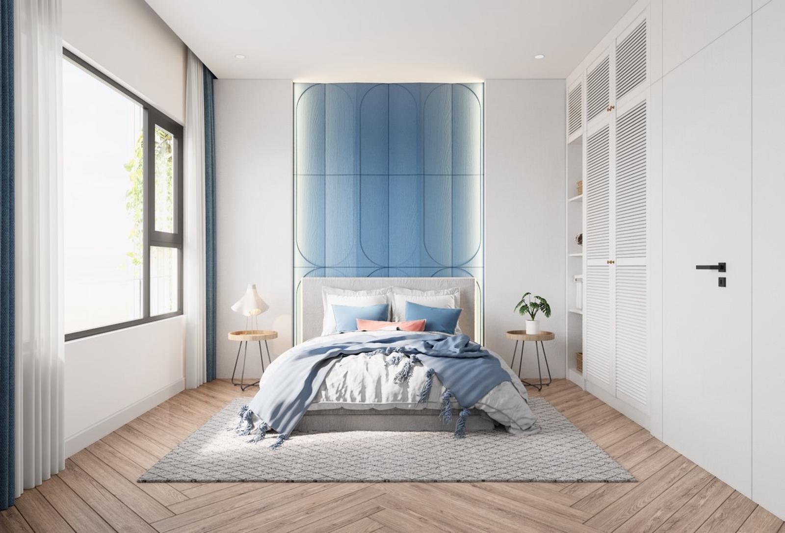 Phòng ngủ trẻ em được sắp đặt hướng trực diện ra hồ điều hoà 4,8ha. Thiết kế hệ cửa sổ kính lớn giúp đón trọn tầm nhìn ra khoảng không gian xanh rộng lớn như một điểm chấm phá tươi mát cho cả căn phòng.