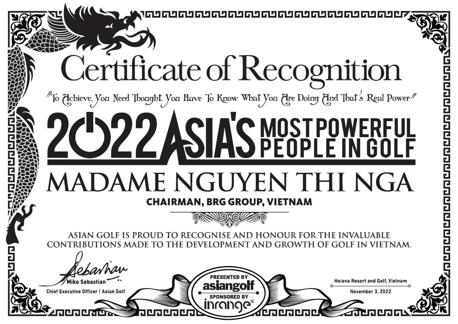 (Thanh tra)- Tối ngày 3-11 tại thành phố Hội An, tỉnh Quảng Nam, Giải thưởng Gôn châu Á (Asia Golf Awards) đã vinh danh Madame Nguyễn Thị Nga, Chủ tịch Tập đoàn BRG là “Người có tầm ảnh hưởng nhất châu Á trong lĩnh vực gôn”. Đây là lần thứ 2 liên tiếp Chủ tịch Tập đoàn BRG được vinh danh ở giải thưởng quốc tế này.