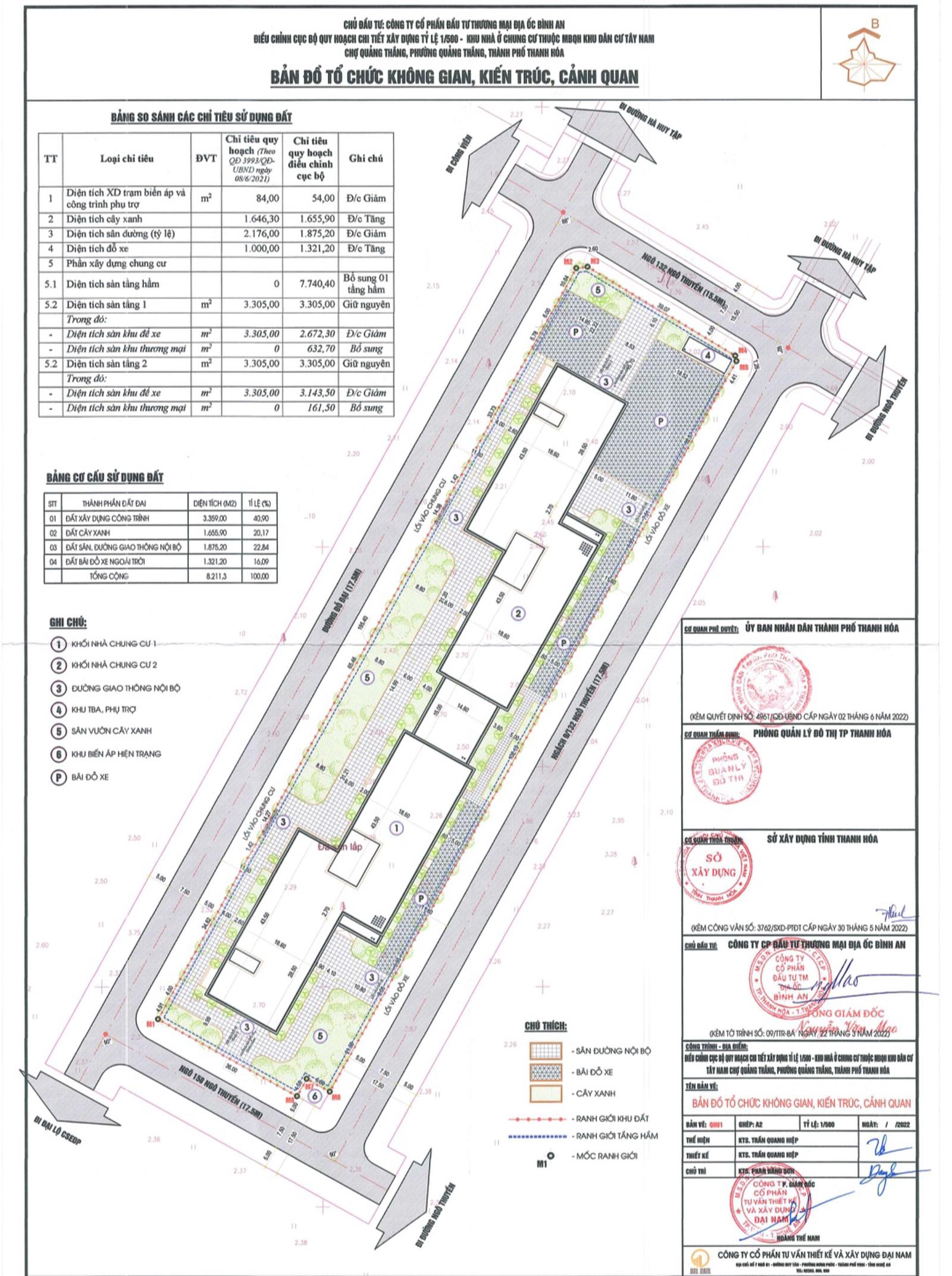 Trước đó, ngày 2/6/2022 ông Nguyễn Văn Hùng, Phó Chủ tịch UBND TP Thanh Hóa đã ký Quyết định số 4961/QĐ-UBND về việc phê duyệt điều chỉnh cục bộ quy hoạch chi tiết tỷ lệ 1/500 Khu dân cư Tây Nam chợ Quảng Thắng (Chung cư Bình An Plaza). Tại phần 3 nhỏ của Quyết định này có các nội dung thể hiện như sau: “Nội dung điều chỉnh quy hoạch, điều chỉnh bổ sung 1 tầng hầm để xe với diện tích là 7.740,4m2. Điều chỉnh không gian bố trí chỗ để xe, khuôn viên cây xanh, trạm biến áp trên tổng mặt bằng cho phù hợp với kiến trúc cảnh quan và công năng sử dụng...